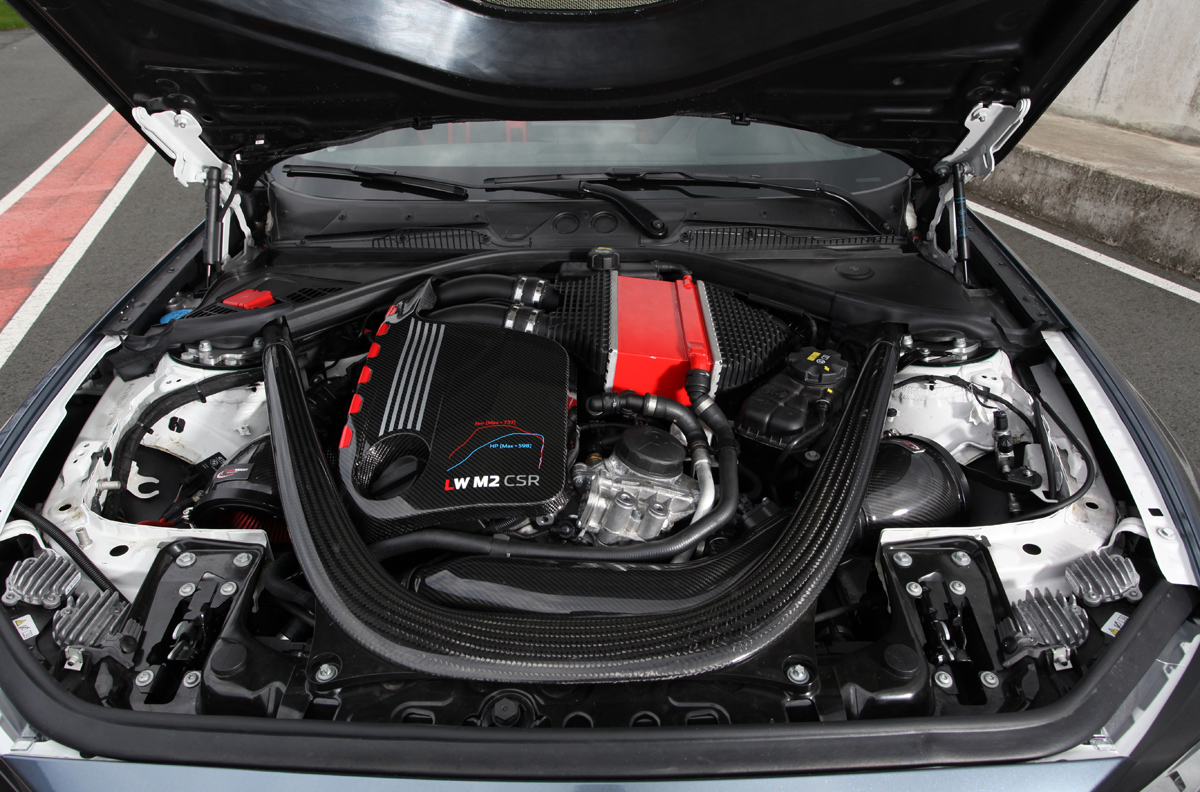To back up all of those aggressive looks, the team at LIGHTWEIGHT ditched the factory engine and replaced it with the S55 unit found in the BMW M4 GTS including the factory water injection system. The LW M2 CSR also received a new titanium exhaust starting from the downpipes, improved air intake, and modified turbochargers along with an ECU software tune. This results in a monster 613 horsepower and 566 lb-ft. of torque. After test driving this configuration on the track, the LIGHTWEIGHT team had to turn things down to 590 horsepower and 544 lb-ft. of torque (with 516 lb-ft. being available from 3,000 to 6,200 RPM) in order to make driving at the track easier. However, it is still is able to reach a 204 mph top speed after the de-tune.