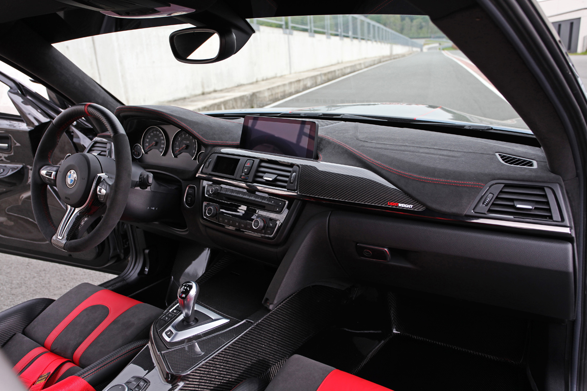 Inside, the LIGHTWEIGHT team gave the LW M2 CSR a focused interior with a bit of comfort. Soft alcantara and nappa leather with red double-contrasting stitching is worn by the new carbon seats, which match the new hub-centered steering wheel upholstery. For track safety, the LW M2 CSR features a custom-made titanium sport bar was installed along with six-point harnesses for driver and passenger. Shedding even more weight are carbon footwells alongside a thin carpeting.