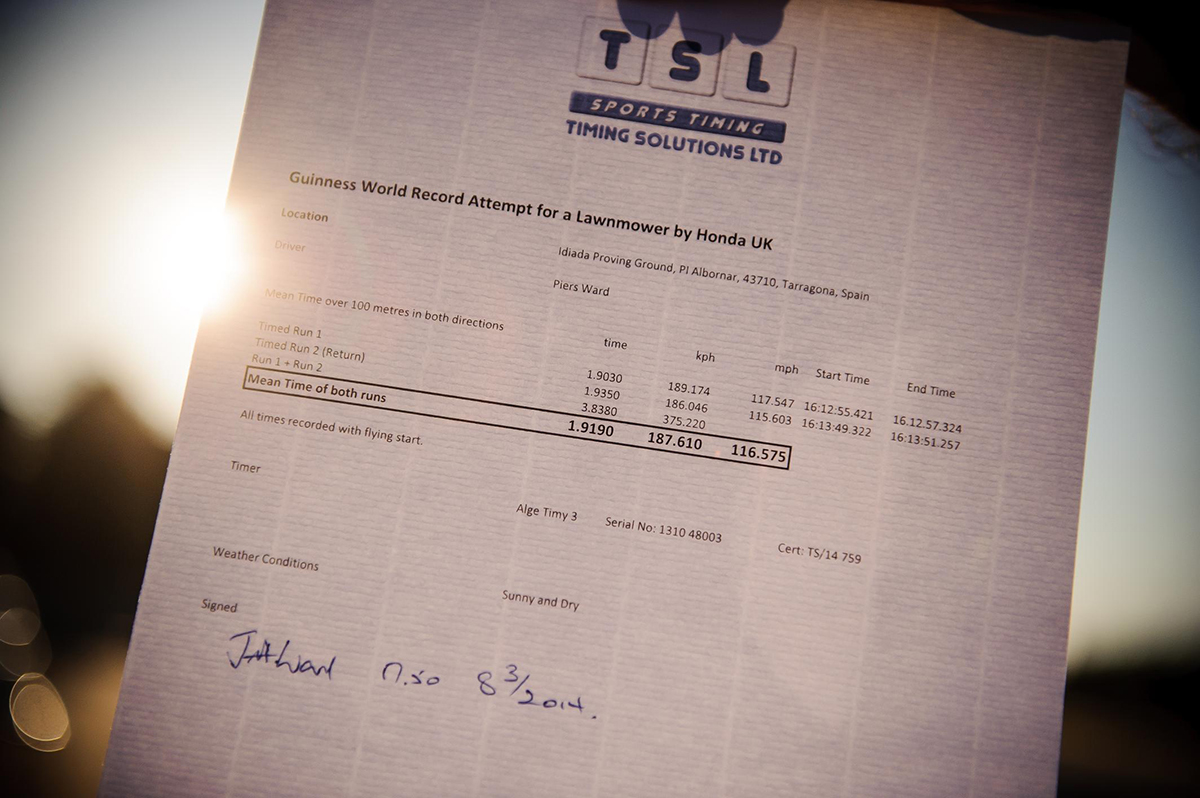 The Honda, Guinness World Records, and Timing Solutions Limited teams assembled at the IDIADA Proving Ground, in Tarragona, Spain, on Saturday 8th March 2014 to record the incredible feat of lawn care engineering. Piers Ward of BBC TopGear Magazine was behind the wheel and with good reason too. He had previously set the world record back in 2010 for fastest lawn mower with an 87.83 mph run.