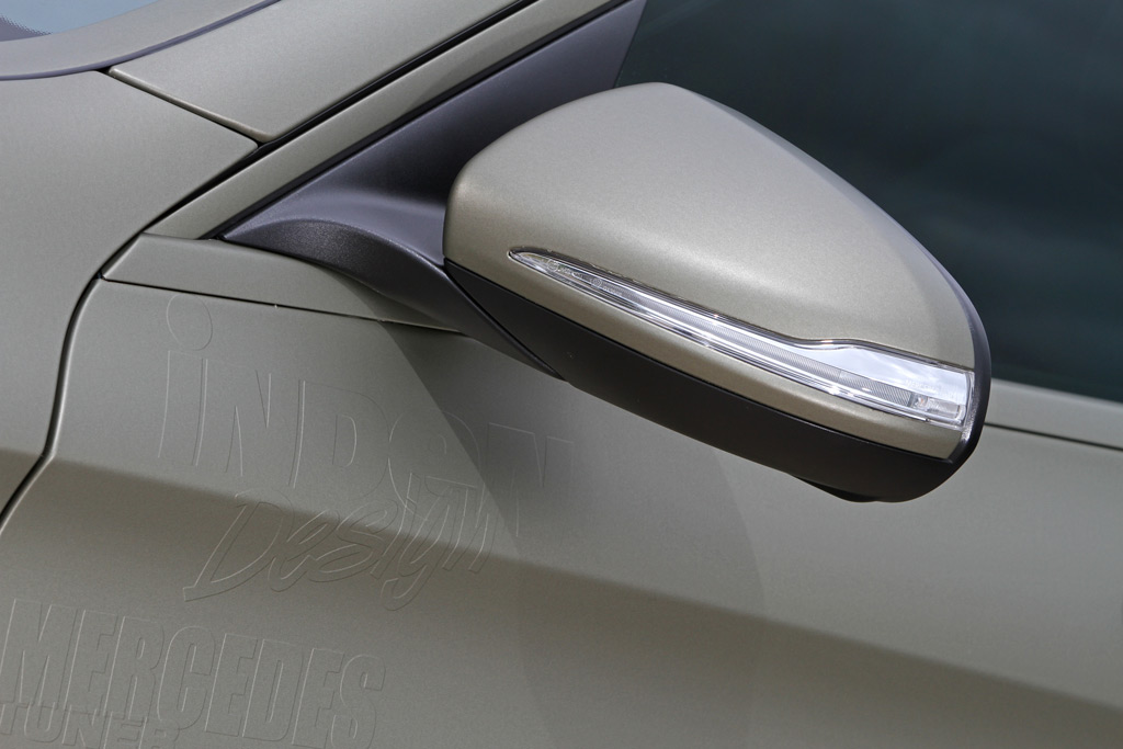 With model, Angela Kutscher, by its side, the new Inden Design Mercedes-Benz C-Class has a more commanding presence. The entire exterior is transformed by a new dull sandstone metallic wrap from TTS (Timos Tuning Smithery) on top of the factory Obsidian Black Metallic paint. The C-Class also wears the factory AMG-Line appearance package with new aprons and sills for a more dynamic appearance. The front flap, side skirts, and other parts get a contrasting gloss black finish to provide some aesthetic balance.