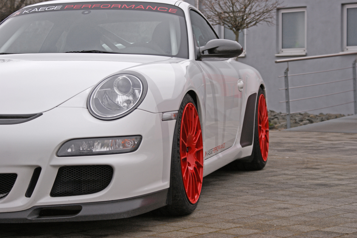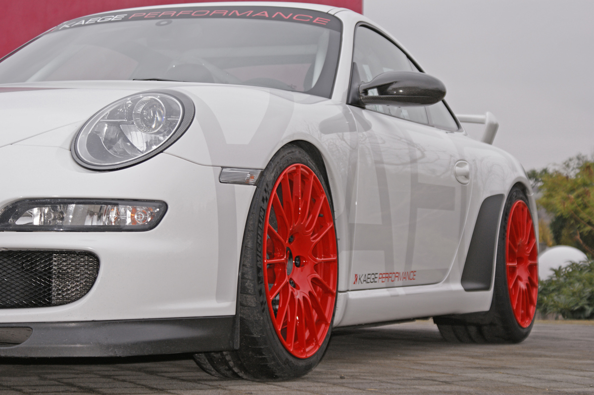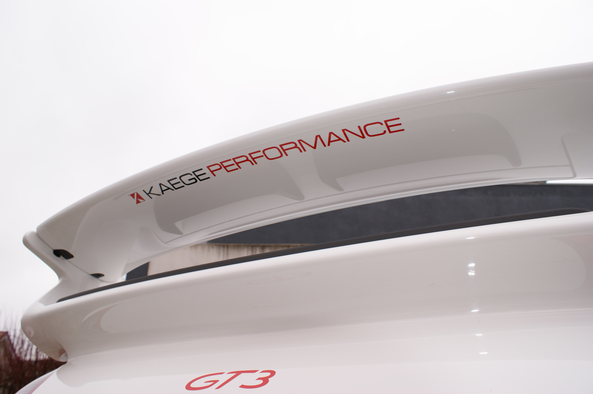 Cutting weight and upping power while improving driving characteristics were the goals for KAEGE with this Porsche 911 GT3. The high-revving 3.6-liter flat-six engine benefits from a new M+M noise reduction system, racing headers, and dual 200-cell catalytic converters that cut 15.4 lbs. of weight. A new air filter freely sucks fresh air into the engine. The factory hydraulic power steering pump was replaced with a new electric pump to free up power and reduce weight even more.