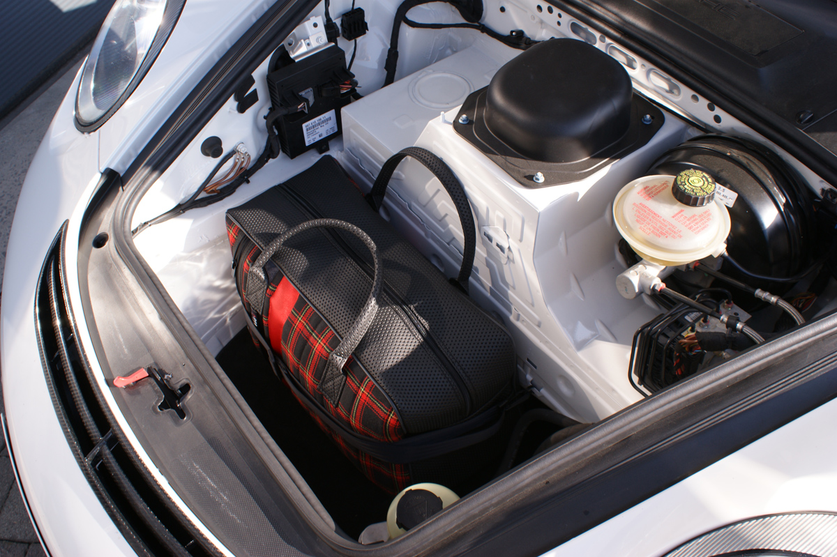 But KAEGE wasn’t finished there. The interior was fitted with a new set of lightweight retro-styled checkered fabric complete with matching travel and helmet bag. The center console, roll cage, and other parts have all been color-matched to the exterior. The front trunk was also cleaned out of any unnecessary equipment.