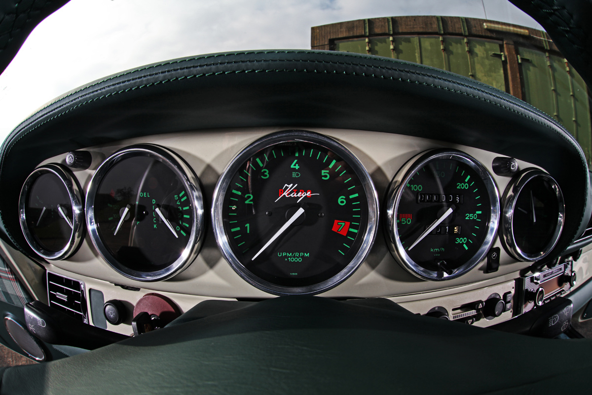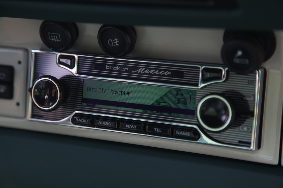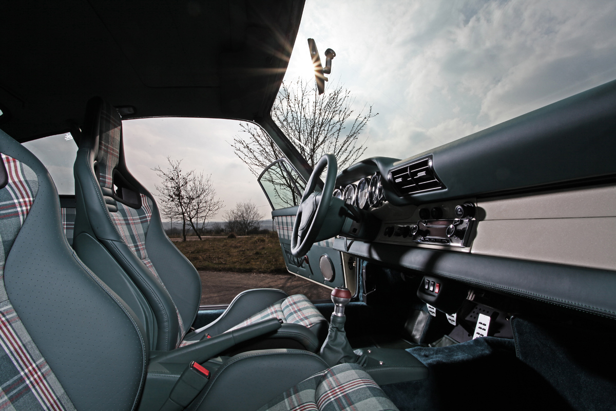 Inside, KAEGE RETRO gave the 911 an old-school ‘70s look with plaid upholstered Recaro seats and green leather trim, dashboard, steering wheel, and carpeting with contrasting cream white trim. Classic gauges and a retro-look shifter with brown knob lends to a classic appearance and feel. Even the radio and navigation has been transformed thanks to a Becker unit.