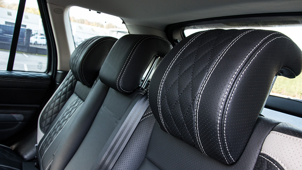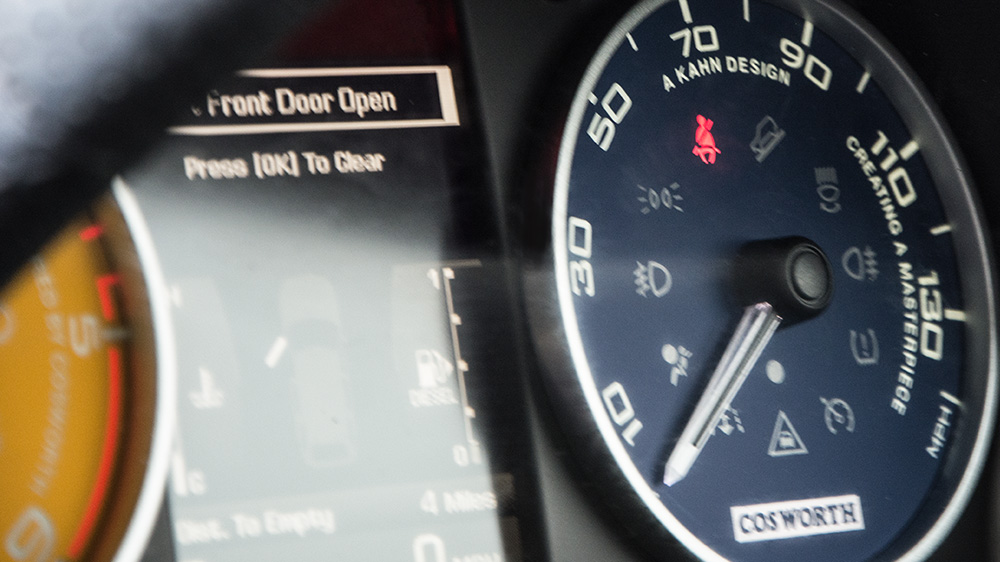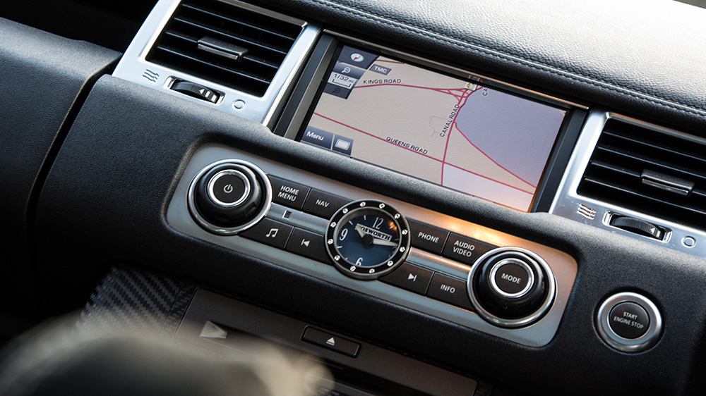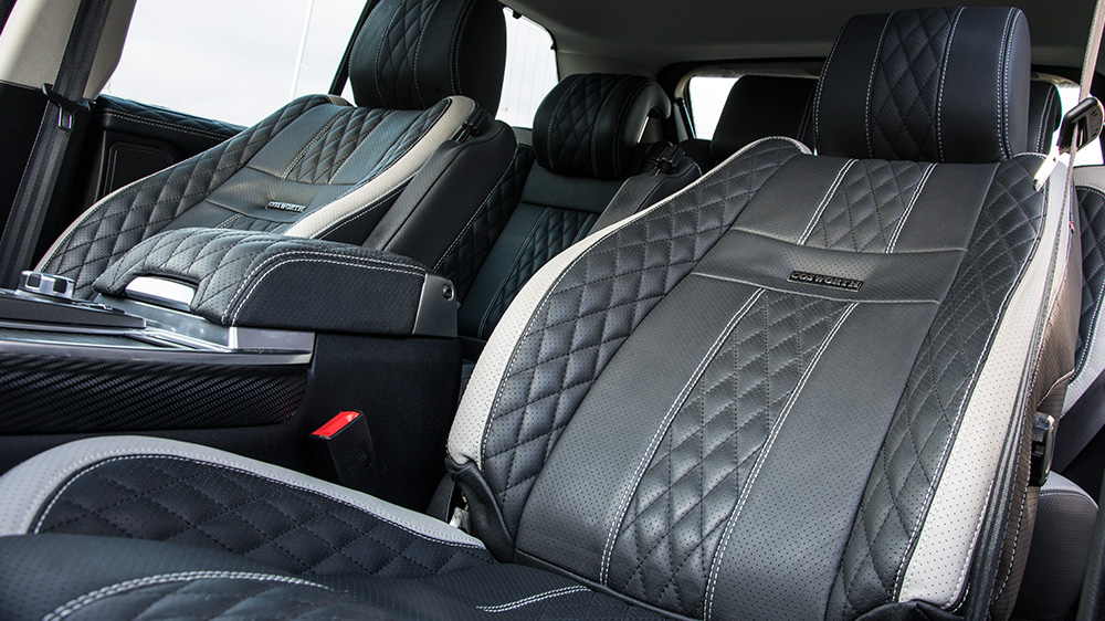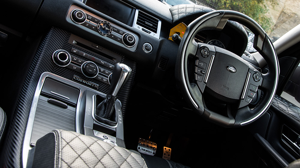 The exterior may be aimed at performance, but the inside of the A Kahn Design Range Rover Sport 3.0 SDV6 RS300 Cosworth Edition is built for custom-tailored comfort. Hiding behind the privacy tinted glass are front and rear seats dressed in perforated black leather with a diamond-quilted center glove box and gauge cluster bonnet. A Kahn time clock fascia and machined aluminum vented pedals add that extra special touch for the driver.