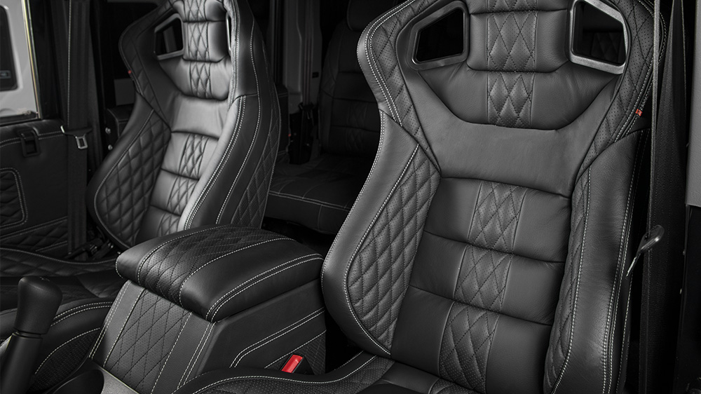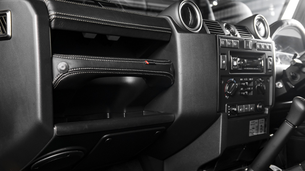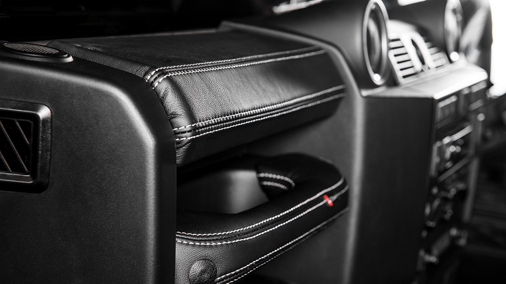 Inside, things are a bit more refined. The Land Rover Defender 90 Chelsea Wide Track Edition features a pair of heated Sports GTB seats up front dressed in quilted and perforated leather. Black leather is worn by the center glove box, instrument binnacle, passenger dashboard, and door handles. A Kahn billet steering wheel with black leather faces the driver along with a custom-designed tachometer, and vented machined aluminum foot pedals. Adding a taste of style is a matte black center console fascia and a Churchill time clock.