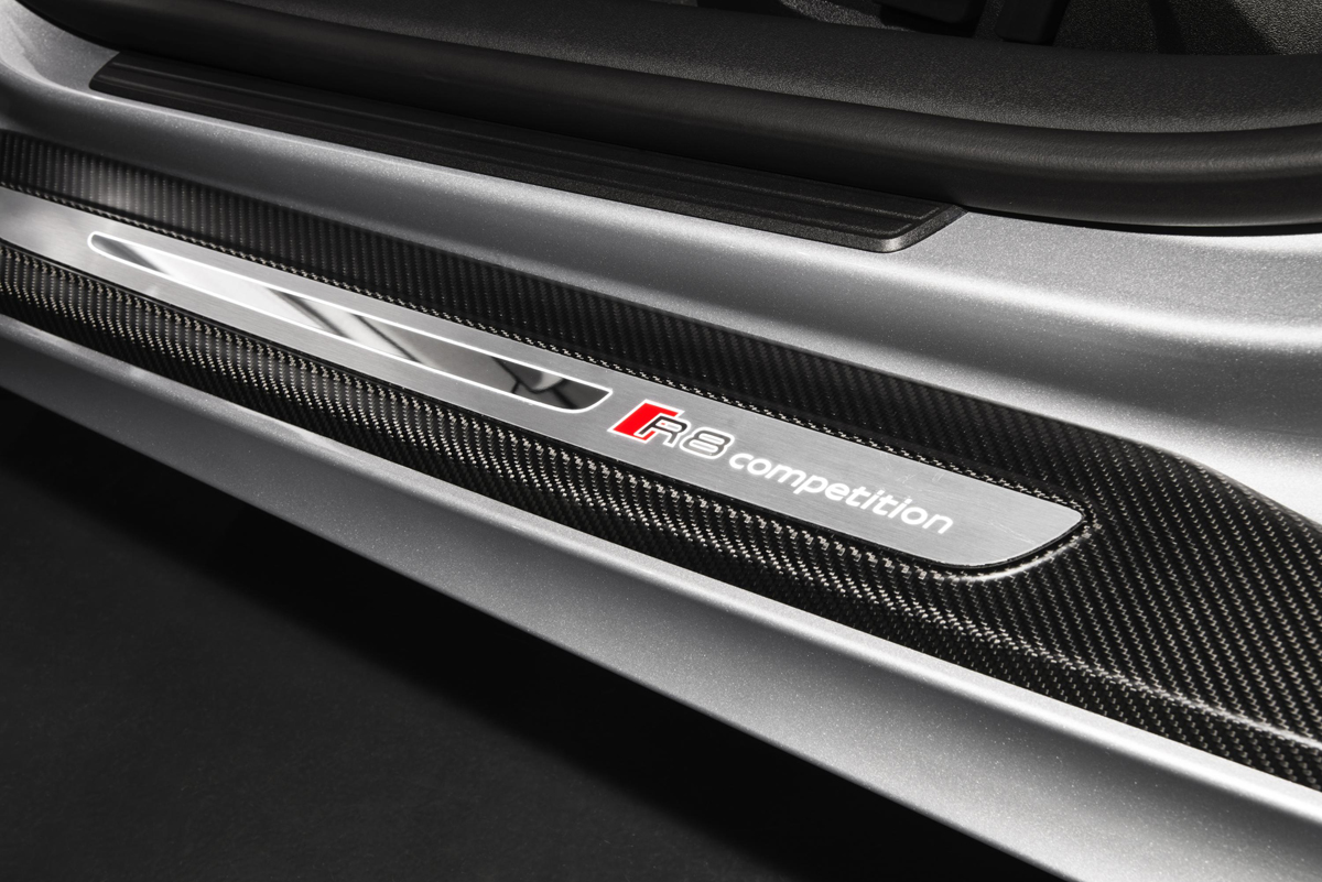 Inside, owners of the 60 Audi R8 Competition models will be greeted with special carbon fiber appointments and be able to custom-tailor their interior as well. Matte carbon fiber adorns much of the cabin including the center console and illuminated door entry sills bearing the “R8 Competition” nameplate. Being that the limited-edition supercar is an Audi exclusive line vehicle, owners can select from a virtually limitless palette of colors inside and out as well as wheel finishes and more to create a truly custom-tailored vehicle.