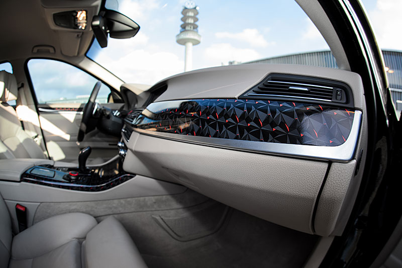 But what makes the Fostla BMW 550i a real head-turner is its new exterior transformation. The wrapping specialists added on a new Urban-Taupe-Matte-Metallic/Gray-Olive-Matte-Metallic wrap that lends a smoother, stealthy figure to the sports sedan. A new front spoiler lip and rear diffuser sport a glossy black color to add some contrast while the windows, headlights, and taillights are all tinted black. Inside, new custom-designed trim wrapping and a soft-coated leather sports steering wheel adds a more dynamic and exclusive touch.