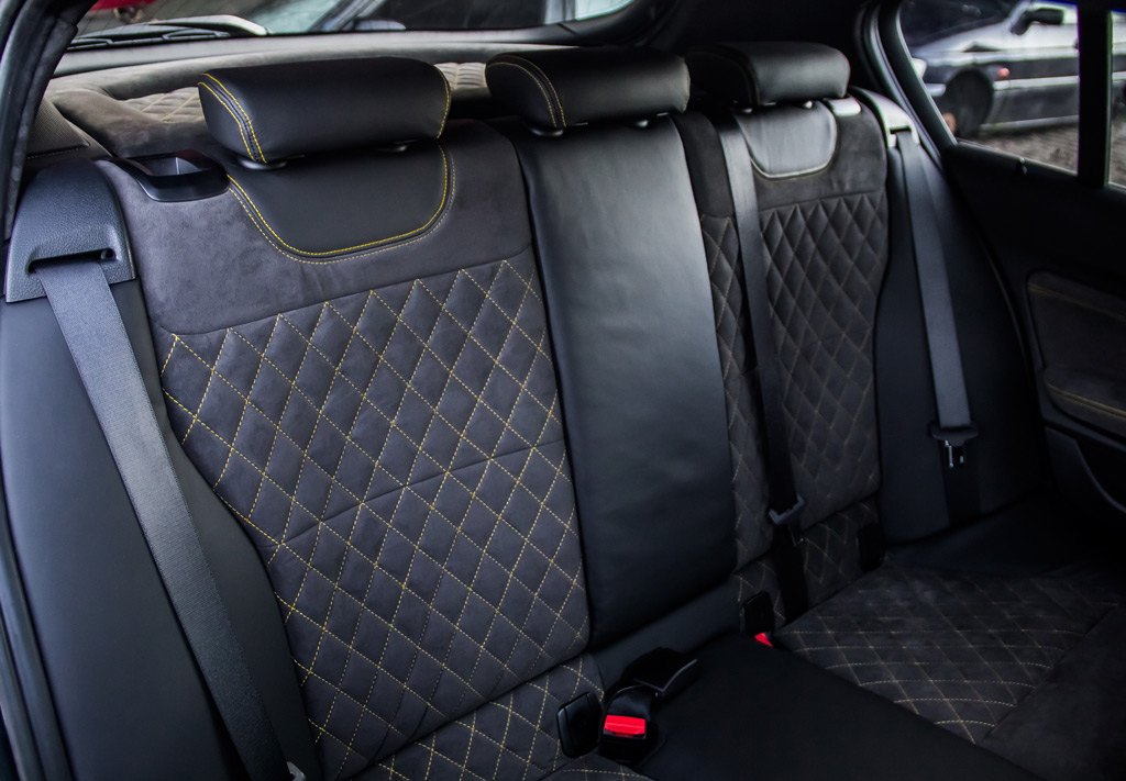 What really grabs attention when the Manhart Racing MH1 400 M135i isn’t speeding down the autobahn is its menacing new look. The entire exterior wears a “longitudinally polished aluminum in matt black” wrap with yellow “MH1 400” badging, front air intake trims, and side skirts. Optimizing aerodynamics for the triple-digit speeds the hot hatch craves is a new front spoiler blade, rear diffuser with black stainless steel lattice, and BMW M-Performance rear spoiler. A pair of side mirror flaps adds that final touch of sportiness.