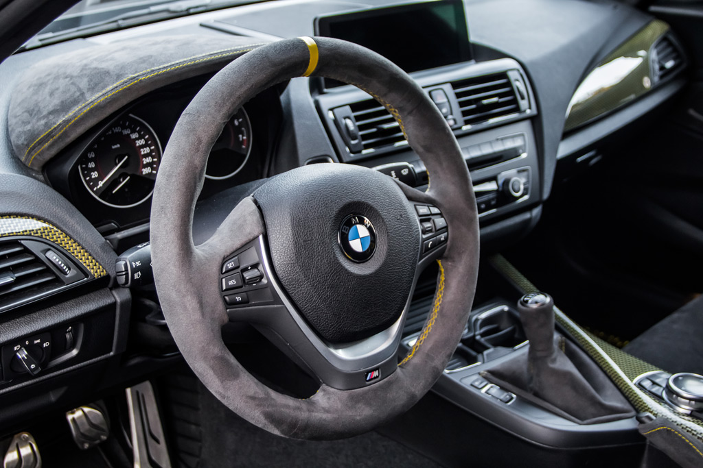Inside, the yellow and black athleticism continues with some performance-oriented goodies. The BMW Performance seats, door panels, steering wheel, gauge housing, center arm rest, headliner, and pillars all wear a mix of leather and alcantara with yellow stitching. The carbon/aramid combo trim that adorns the console, dashboard, and other parts of the cabin matches the yellow theme inside and out of the MH1 400 M135i.