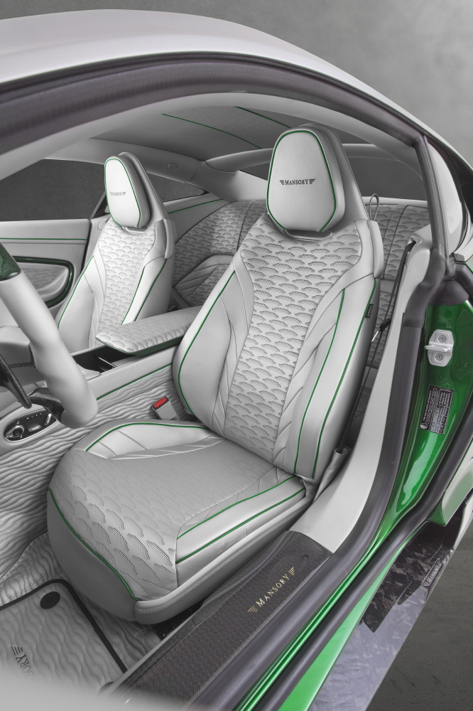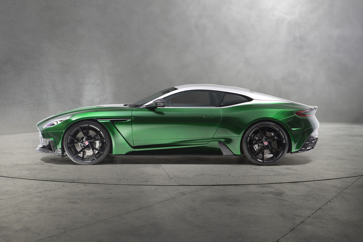This Glossy Racing Green and Silver Mansory Cyrus Aston Martin DB11 also boasts a sharper chassis thanks to new forged wheels and a tailored suspension. New Mansory Yavin one-piece forged wheels were installed and feature a unique three-dimensional directional spoke design that emphasizes power, speed, and class. Here, they’re installed in a 22 x 9.5 front and 22 x 11.0 rear setup with grippy 265/30 ZR22 and 315/25 ZR22 tires. These are paired with progressively wound sports lowering springs that can cut the ride height by 35 mm for a low and athletic stance.