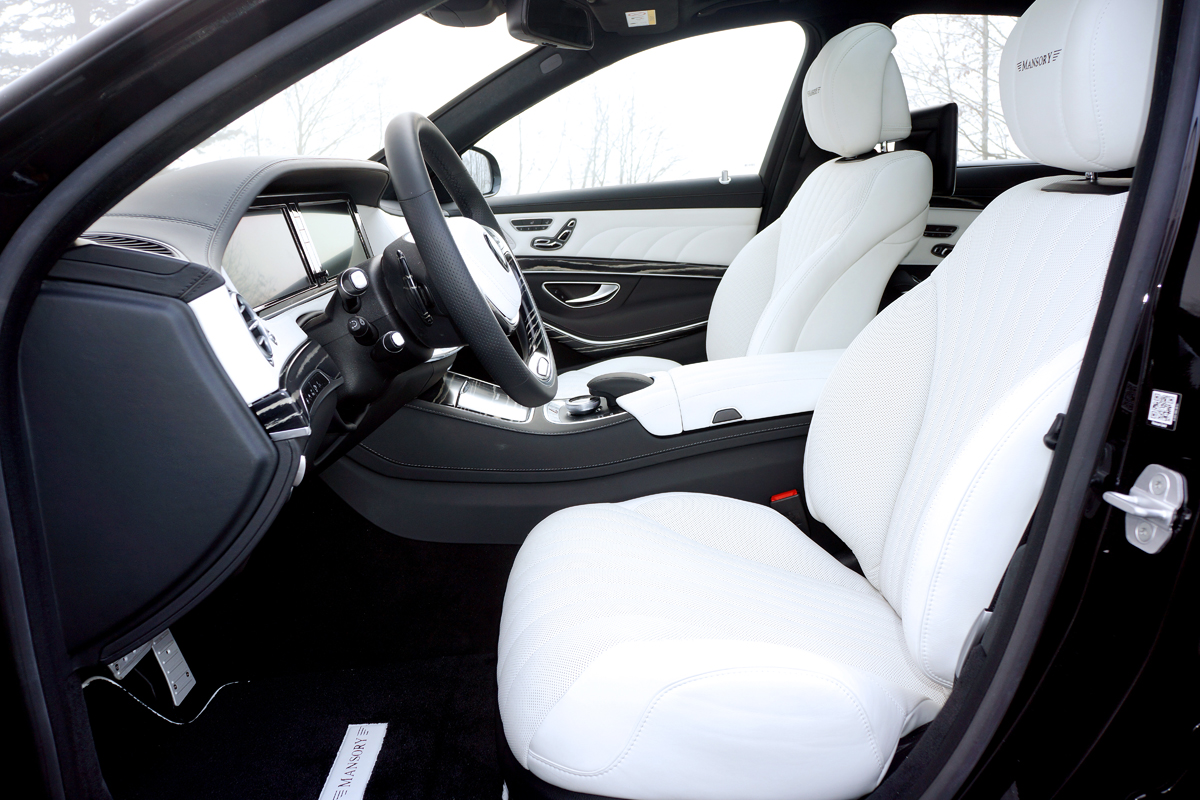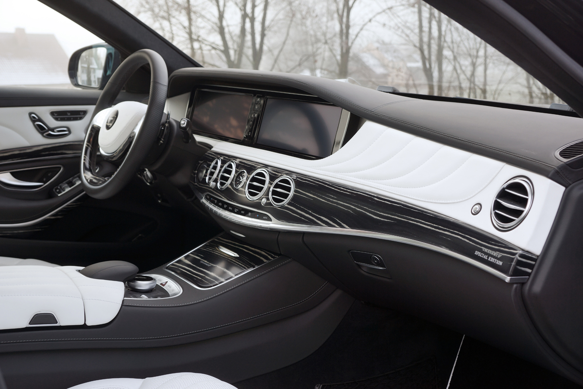 As with all of their conversions, Mansory can make the Mercedes-Benz S 63 AMG a custom-tailored place of extravagant wealth and comfort. Options such as aluminum pedals, new steering wheels, leather-framed floor mats, illuminated door sill trims, and more. On the featured vehicle, Mansory installed a special wood veneer trim along with a soft black and white leather combination with contrasting stitching designs.