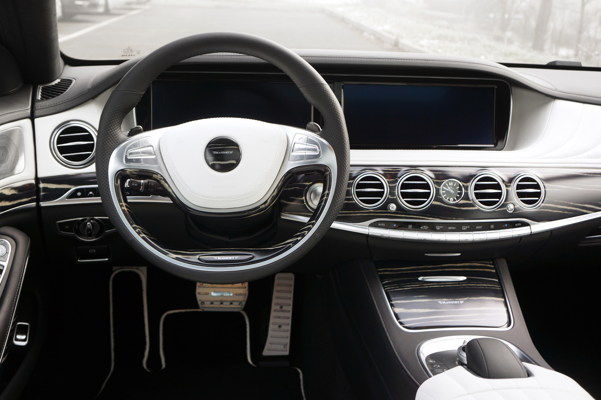 As with all of their conversions, Mansory can make the Mercedes-Benz S 63 AMG a custom-tailored place of extravagant wealth and comfort. Options such as aluminum pedals, new steering wheels, leather-framed floor mats, illuminated door sill trims, and more. On the featured vehicle, Mansory installed a special wood veneer trim along with a soft black and white leather combination with contrasting stitching designs.