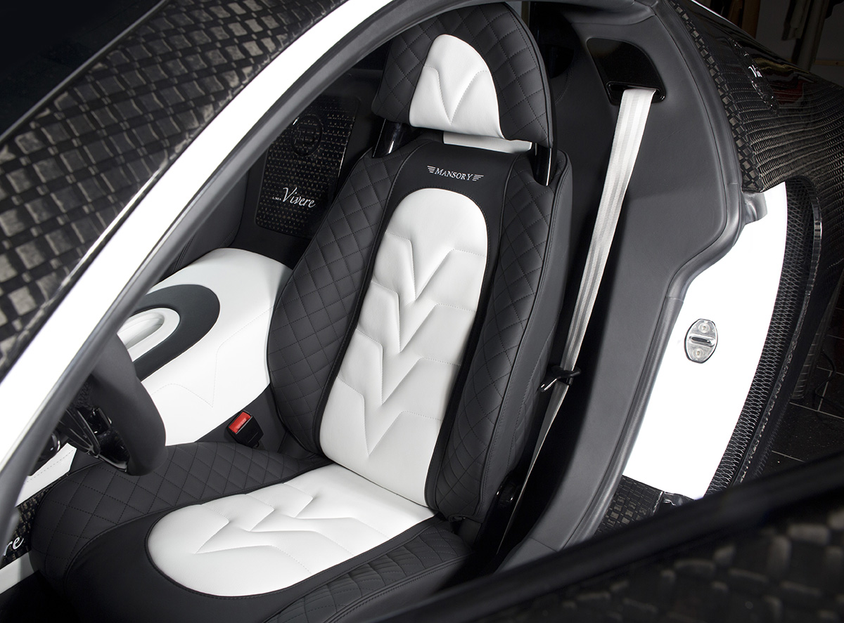 Inside is a white, black, and carbon fiber cocoon of handcrafted luxury and sport. The seats, door panels, and instrument panel have been equipped with new LED ambient lights with a soft glow and highlight all the little details of the Mansory Vivere. Black and white leather with a variety of stitching designs adorns the seats, dashboard, center console, and other elements while carbon fiber in the door panels, center console, and instrument hood hint at the power the Bugatti Veyron possesses. As a special touch, a Mansory Vivere panel is located in the lower section of the center stack. Drivers will enjoy a special ergonomically-designed sports steering wheel with leather and carbon fiber inserts along with new shift paddles for greater control.