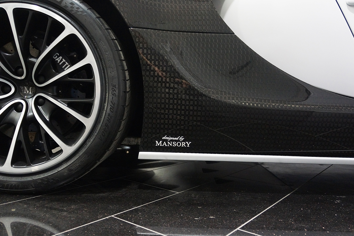 Just about all of the new bodywork for the Mansory Vivere is made from autoclaved carbon fiber that’s ultra-lightweight and incredibly sturdy in order to handle triple-digit speeds. The Bugatti Veyron is featured in a two-tone white and glossy carbon fiber combo with the white flowing from the front towards the rear along the side skirts and roof as they meet at the bumper.