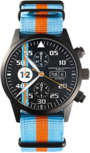It is this Maurice de Mauriac brand that grabbed back to the heydays of car racing by showing a modern-looking chronograph with a ‘Le Mans’ pattern on the dial that reminds us of the Porsche 917 with Gulf striping.