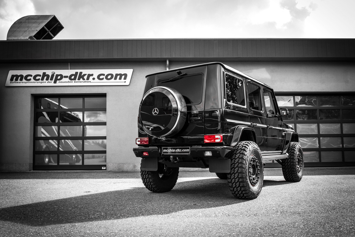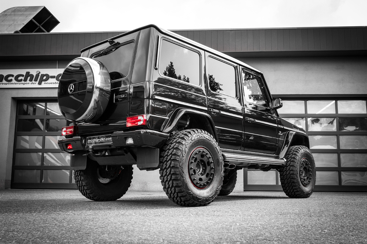 But that was only part of the McChip-DKR MC800 conversion for the Mercedes-Benz G63 AMG. The German tuner wanted to make the SUV even more proficient while going off the beaten path so they added on a new set of axles that add 15 cm of ground clearance and 12 cm of width on each side. Pushing aside the dirt, mud, rock, and anything else that dares to sit in its path are Beadlock wheels measuring 18 inches in diameter with beefy 37/15.2 R18 tires.