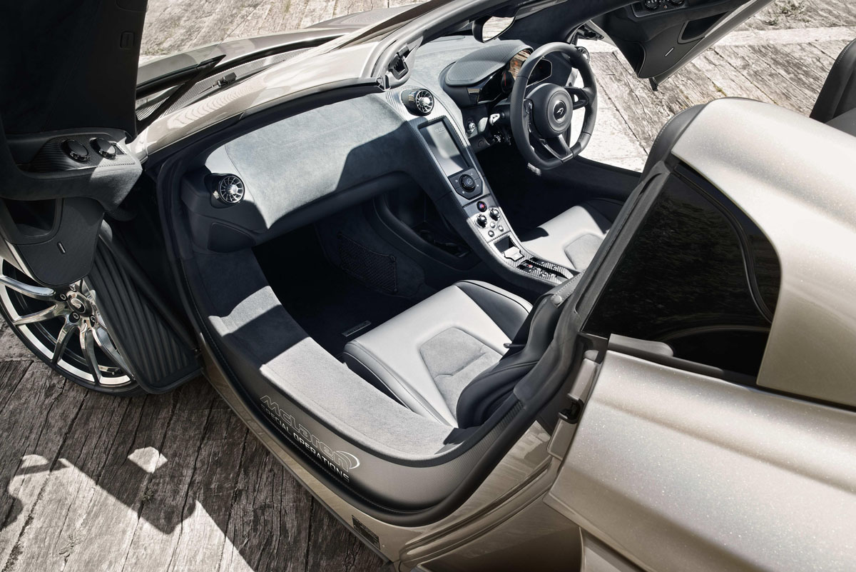 The more aggressive styling of the MSO 650S Coupe and Spider is available in three different colors: ‘Papaya Spark’, ‘Agrigan Black’, and ‘Sarigan Quartz’. The ‘Papaya Spark’ gives the classic McLaren orange a modern touch while the ‘Sarigan Quartz’ is a new color that features a metallic silver finish with a light gold tint. The ‘Agrigan Black’ was featured on the original concept car and has a metallic black with deep ruby red metallic flake to alter the color depending on the angle or the light.