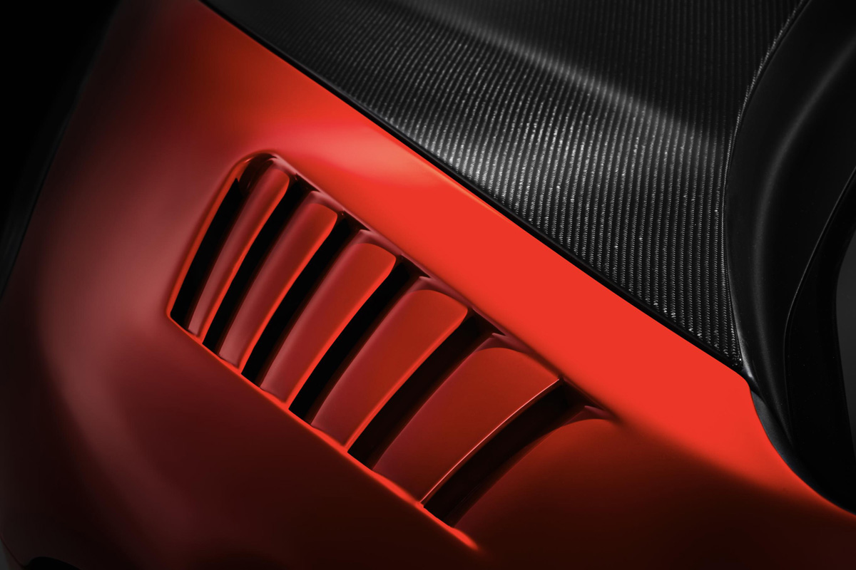 Carbon fiber is used generously throughout the new McLaren 650S Can-Am to keep weight to a minimum from the MonoCell chassis, retractable hard-top, hood, airbrake, splitter, rear bumper center, door blades, and sill covers. MSO has added louvered carbon fiber front fenders that increase downforce while a new quad, circular polished stainless steel exhaust protrudes through the center of the new rear carbon fiber grille.