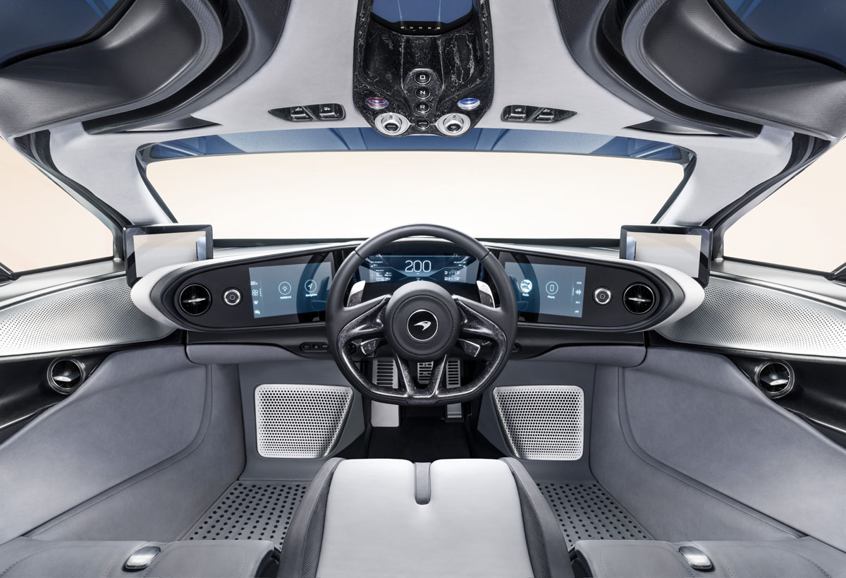 Facing the driver are high-definition touchscreens that replace many of the traditional buttons and knobs in a car. Above, the dihedral doors are seamlessly incorporated into a full glass roof and windscreen. The upper sections of both feature electrochromic technology that allows them to turn opaque at the touch of a button.