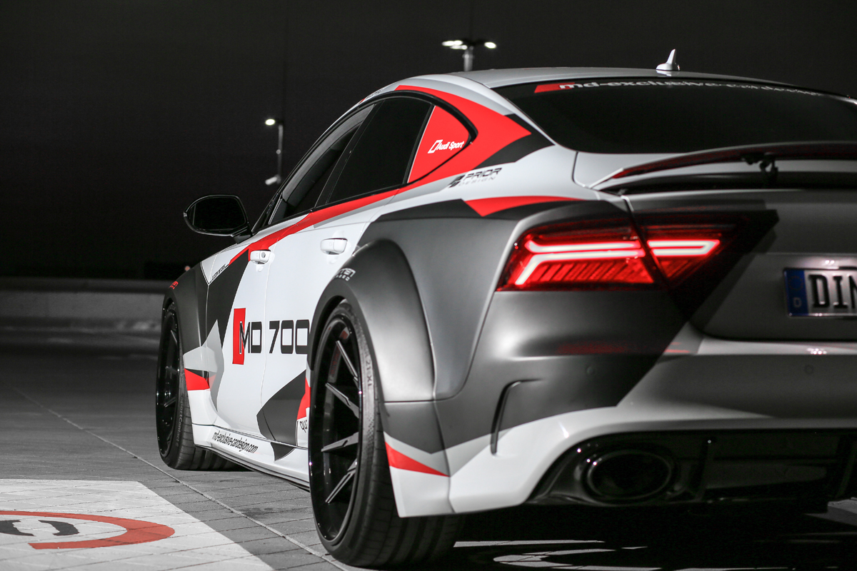 Visually displaying that power is the job of the commanding Prior Design PD700R Widebody kit from Prior Design. The M&D Audi S7 MD700 wears the entire kit proudly, starting with the new front bumper with integrated air intakes and spoiler lip, side skirts, and rear bumper with powerful diffuser. But the biggest eye-catchers are the flared fenders that give the S7 MD700 into a commanding machine.