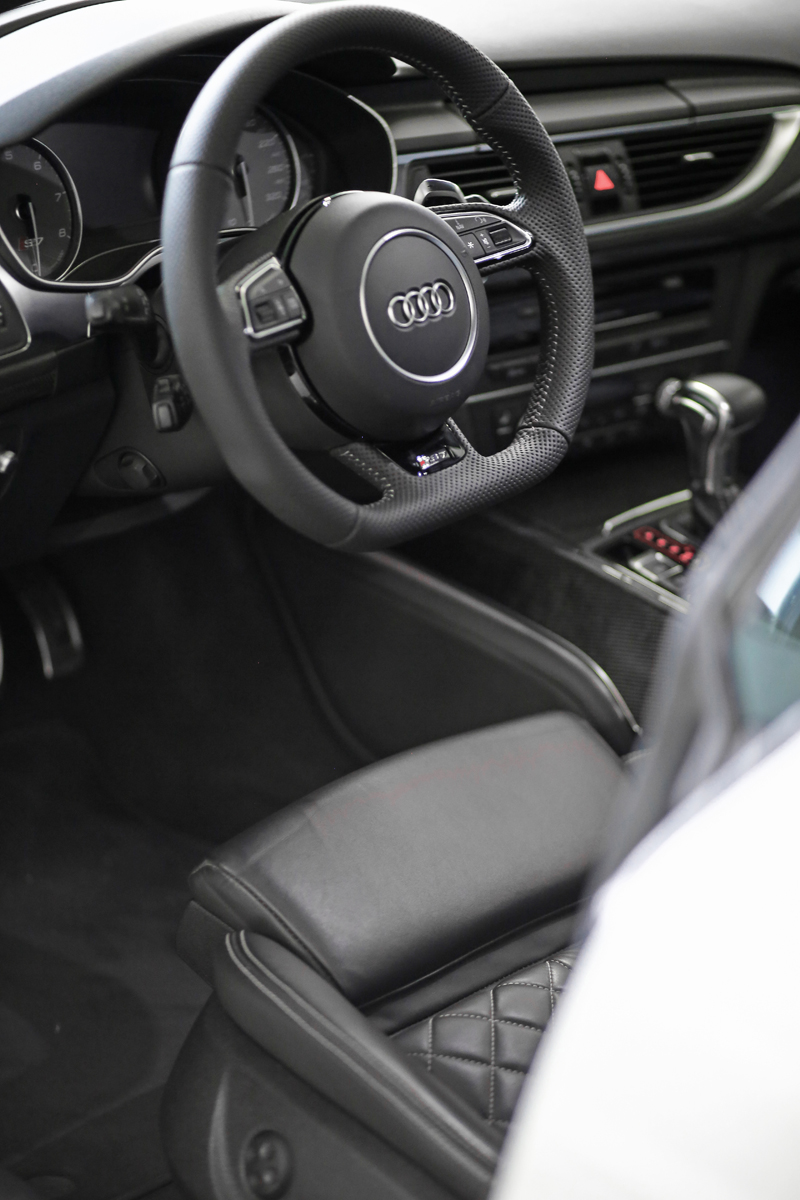Being that this Audi S7 is a 2013-model-year vehicle, M&D decided to install some factory facelifted styling changes. New OEM LED taillights and a gloss black RS 7 front grille add to the car’s dominance. Gloss black air scoops, Audi ring logo, and door mirror caps were also given a gloss black finish. A vibrant Glacier White Metallic pearl effect paint covers the entire body as the base, while a new LeMans Style vinyl wrap with red, black, and grey shapes gives the MD700 a head-turning presence. Tinted windows finish it off.