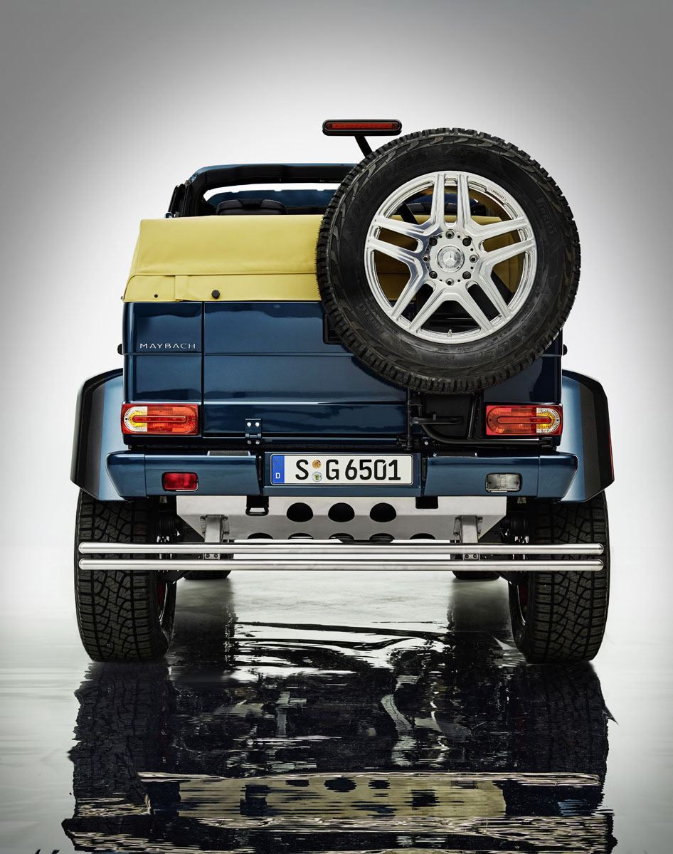 But driving the monstrous Mercedes-Maybach G 650 Landaulet is still pretty entertaining. Many off-road hardware and tech is borrowed from the AMG G 63 6×6 and G 500 4×42 including the portal axles that lend an impressive 450 mm of ground clearance. Drivers can engage the 100-percent differential locks on the move along with the low off-road ratio transfer case. Meaty 325/55 R22 tires are worn by 22-inch five-twin-spoke alloy wheels with a special ceramically-polished finish. Underride guards at the front and rear offer protection over harsh terrain while carbon fiber fender flares house the massive wheels. A spare wheel at the rear also integrates the third brake light.