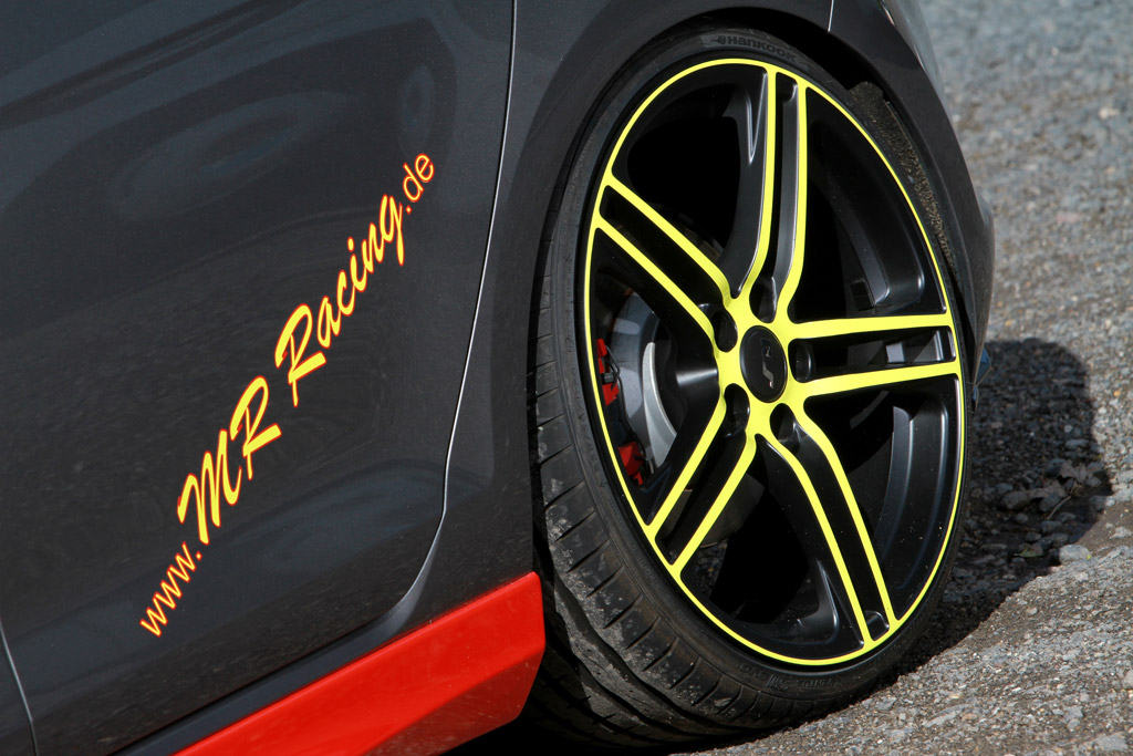 In addition to the engine and sound tuning, MR Racing added on a full Rieger body kit to the Volkswagen Golf GTD. The kit includes a new front spoiler lip and blade setup, new side skirts, and a rear diffuser to help calm airflow along the lower portion of the hot hatch. A new set of SRS-Tec 40 mm wider front arch extensions further emphasize power. After all the new body work was added, a special red and gold wrap was added to highlight the new parts.