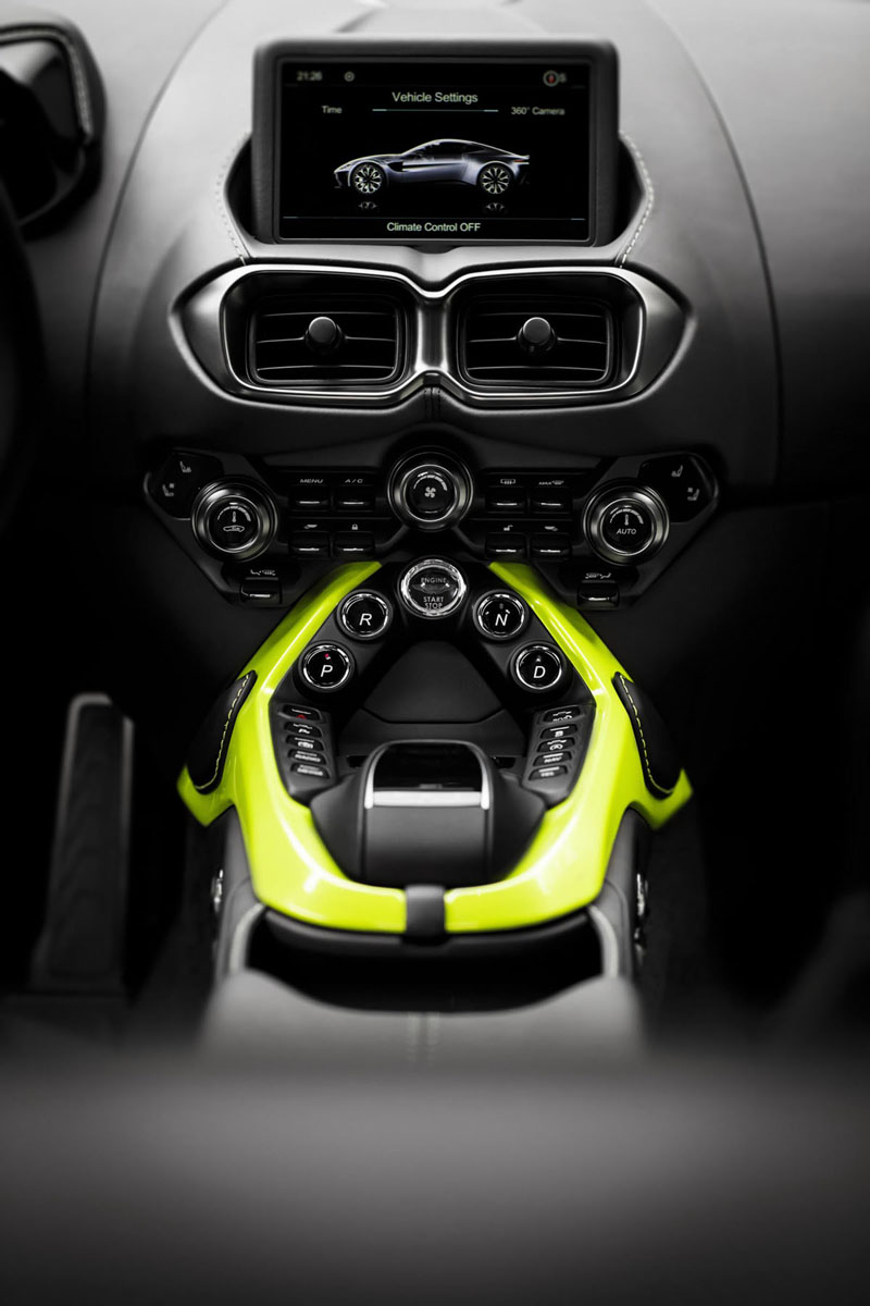 The interior of the new Aston Martin Vantage will feel dramatically new for owners of the previous-generation models. The seating position is 10 mm lower than before while a high-waist, short, and compact theme creates a driver-focused environment as opposed to the rich, luxurious previous-generation model with its waterfall center console. New rotary and toggle controls provide quick and easy functionality while the PRND transmission buttons form a triangular formation in the center console below the HVAC and infotainment controls.
