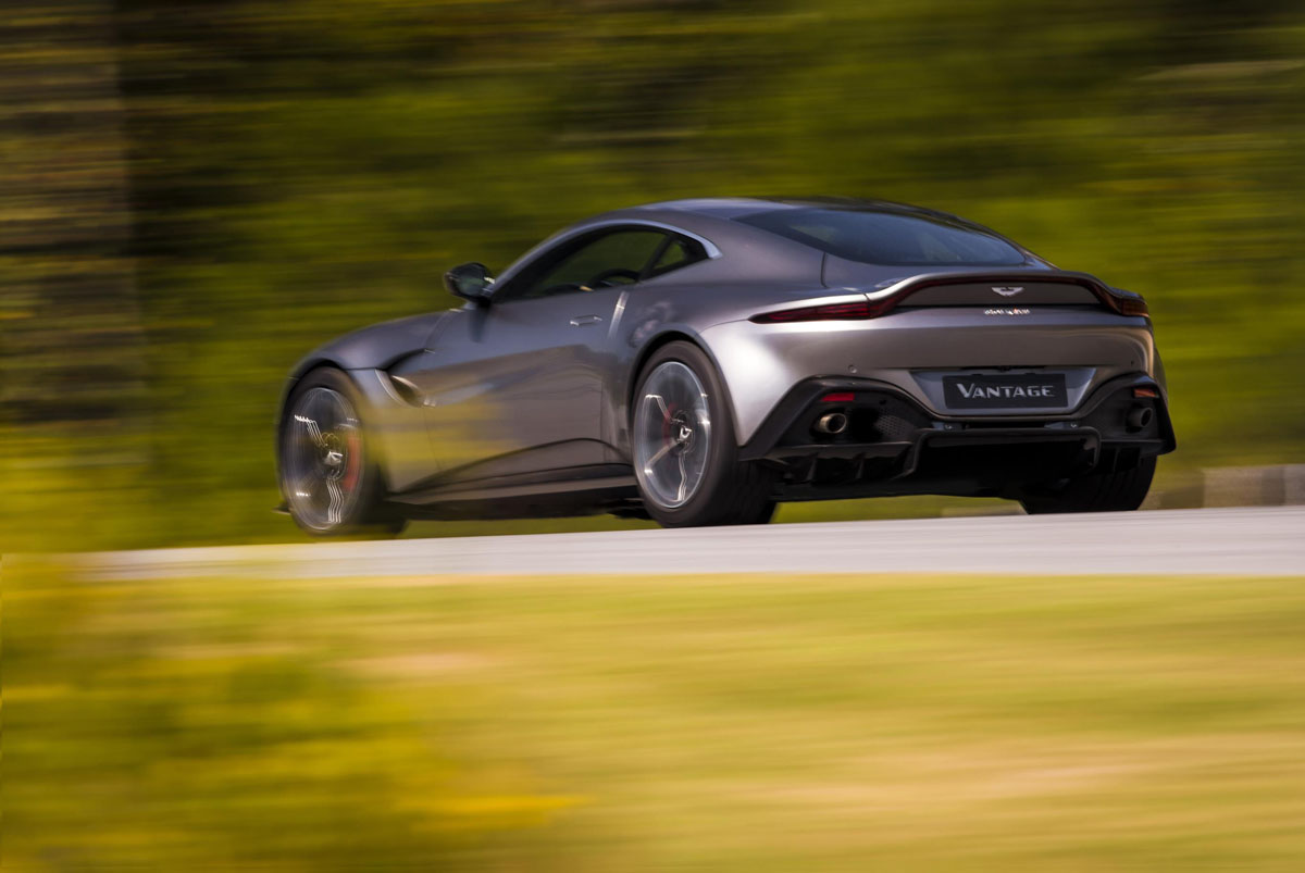 The new twin-turbocharged 4.0-liter V-8 engine produces a hefty 503 bhp at 6,000 RPM and 505 lb-ft. of torque from 2,000 to 5,000 RPM in the new Aston Martin Vantage. That power is sent through a rear-mounted ZF eight-speed automatic that’s been calibrated to provide crisp and quick gear changes using steering wheel-mounted paddle shifters. This enables the Vantage to reach 60 mph in just 3.6 seconds from rest and hit a top speed of 195 mph. A new Electronic Rear Differential (E-Diff) is also used for the first time on an Aston Martin. The E-Diff can go from fully open to 100-percent closed in milliseconds, and is fine-tuned to the car’s behavior and driving modes.