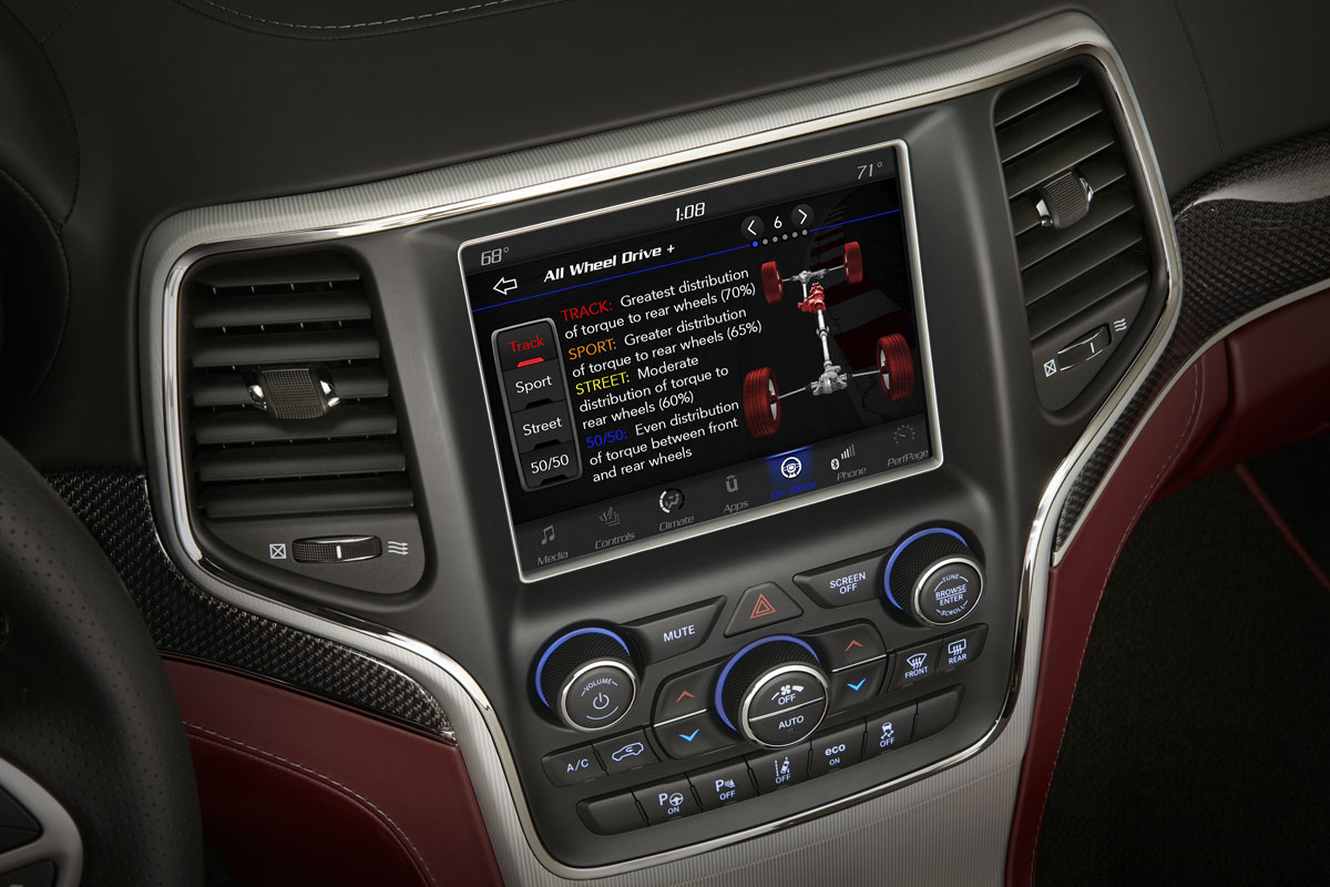 That incredible performance also comes as a result of the upgraded drivetrain and beefed up TorqueFlite eight-speed automatic. New transmission software takes a number of factors into account to provide quicker acceleration and downshifts. The Jeep Quadra-Track on-demand four-wheel drive system provides plenty of grip from the start. A Standard Launch Control utilizes a new Torque Reserve system by pre-filling the engine with boost using the bypass valve and managing the spark timing for more torque right off the line.
