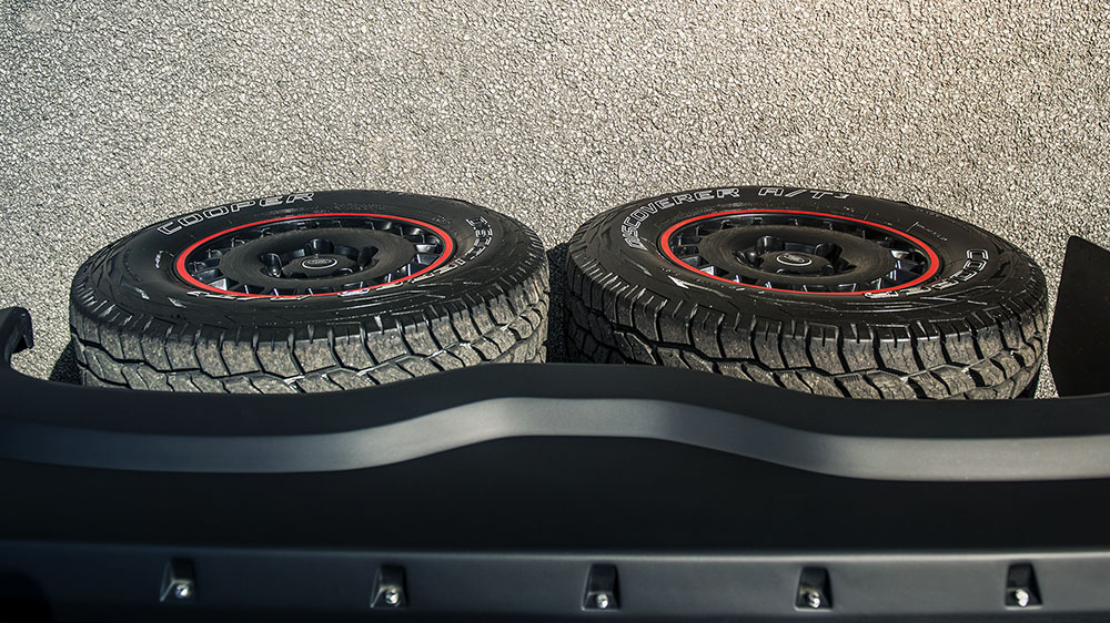 The original Land Rover Defender 110 that the SUV is based on has undergone a massive transformation to become the Kahn 6.2 V8 Flying Huntsman 6X6 Defender Double Cab Pick Up. The Defender was extended and a new axle was installed for true six-wheel drive. The heavy-duty chassis also benefits from an upgraded suspension and a new set of Chelsea Truck Company 1945 Retro Alloy wheels measuring 18 x 8.0 on all three axles. These Matte Black finished wheels with striped edging also wear meaty Cooper tires that are perfect for off-road excursions.