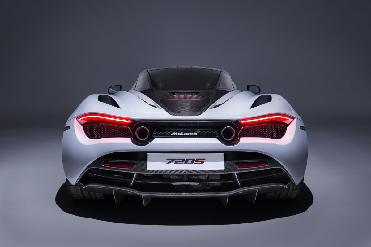 At the rear, the McLaren 720S culminates in a tapered shape with thin, curving LED taillights that sit beneath the integrated active spoiler system. Two high-mounted exhaust outlets sit between the taillights and help create a cleaner aerodynamic profile with the rear diffuser.
