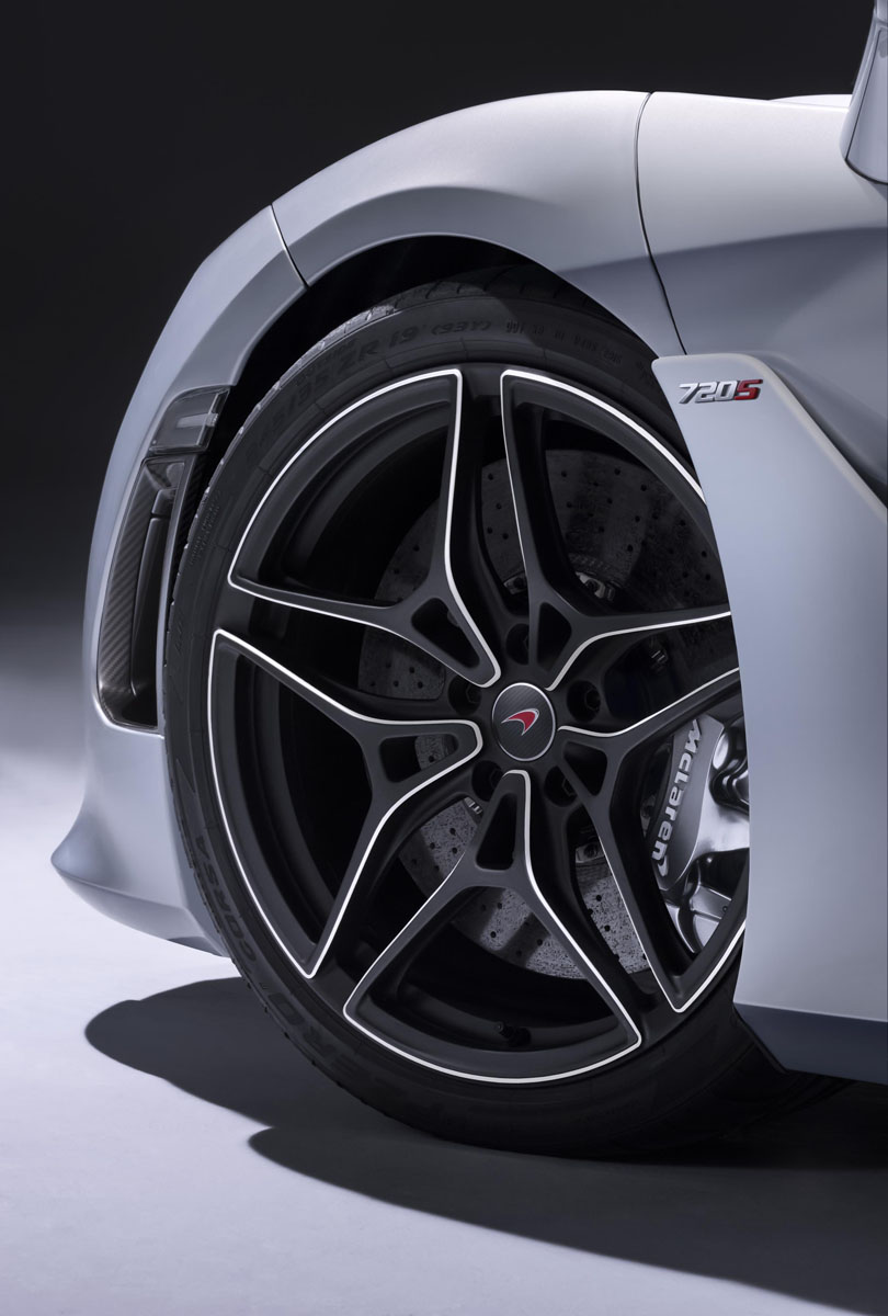 Making the McLaren 720S so nimble on the track are independent dampers, dual wishbones, and the newest Proactive Chassis Control II (PCC II). The suspension can also be adjusted to provide a comfortable ride for daily driving duties as well. Coming standard are 19 x 9.0J front and 19 x 11.0J wheels with sticky tires and 390 mm front and 380 mm rear carbon ceramic brake discs.