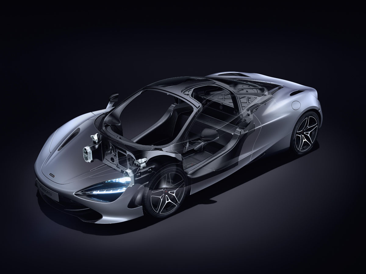 The new McLaren 720S is lighter, faster, and more dynamic than the 650S that it replaces in the Super Series lineup. Its full carbon fiber tub and McLaren Monocage II help give it an extremely low 2,829-lb. dry weight. Various aluminum alloys make up much of the chassis as well as body panels to keep weight to a minimum.
