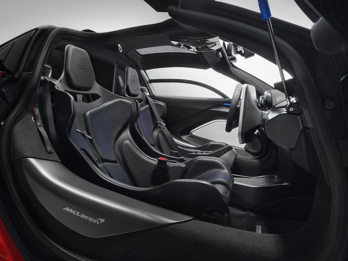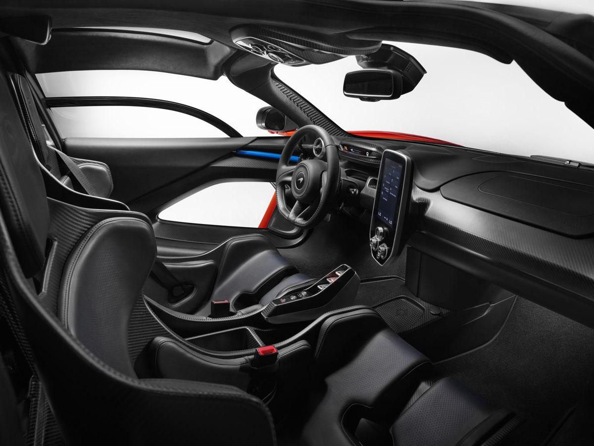Inside, designers and engineers kept the cockpit clean and minimalistic to ensure maximum focus on the driving experience. Carbon fiber is used everywhere with the customer’s choice of leather or Alcantara for the seats, side airbags, and fascia. The three-spoke steering wheel has no buttons or switches, only the paddle shifters behind. A high-def McLaren Folding Driver Display and central infotainment screen display all relevant information while basic controls are kept to a minimum in the center layout. Above the driver’s head is the HVAC control, ‘Race’ mode, engine start/stop button, and door release. Storage is limited to a small space behind the seats with room for two helmets and racing suits.