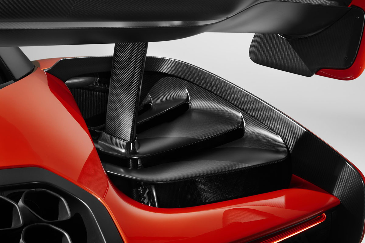 The race-inspired aerodynamic design is taken a step further with state-of-the-art active aerodynamics situated at the front and rear. A large double-element carbon fiber rear wing sits at 1,219 mm at its highest point when the McLaren Senna is stationary. The hydraulically-actuated wing has a surface area of more than 6,500 square-cm., and is constantly adjusting to optimize aerodynamic balance and downforce, or functioning as an airbrake. A double-diffuser made from a single piece of carbon fiber sits beneath. The piece starts at the rear axle and expands outwards with its fins to create a low-pressure zone that sucks the car to the pavement.