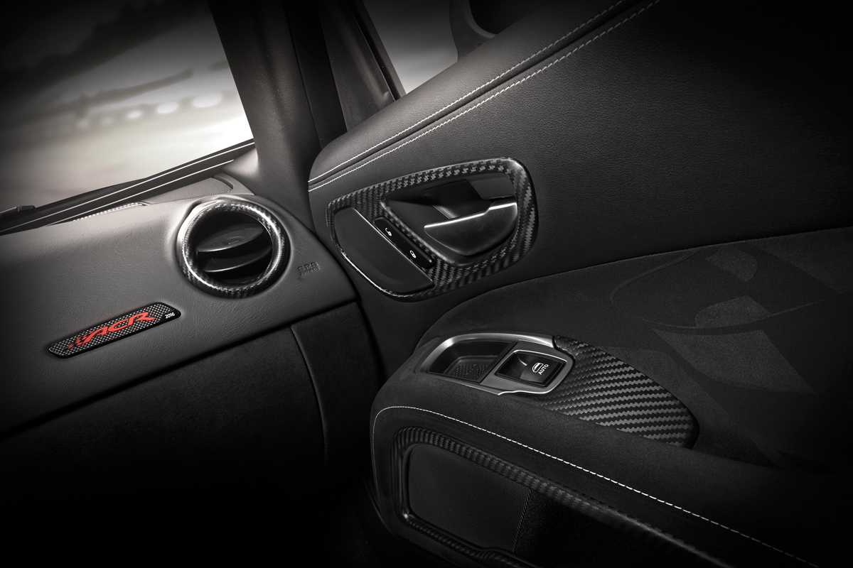 The interior of the 2016 Dodge Viper ACR has lightweight parts and grippy Alcantara trimmings. The instrument binnacle, lower instrument panel, and door armrest panels all wear Alcantara suede while Alcantara inserts are featured on the high-grip seats. Drivers grab onto an ACR-exclusive high-grip steering wheel with color racing stripe and badging. Lightweight carpeting and minimal three-speaker audio system help shave off a few extra pounds from the supercar. A special dashboard-mounted plaque in carbon fiber showcases the exclusivity of the track-spec weapon.