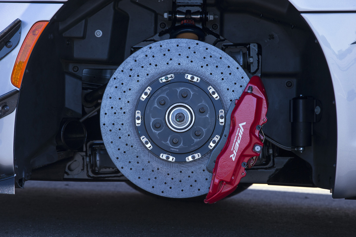 The final part in the upgraded chassis for the 2016 Dodge Viper ACR are new lightweight Brembo Carbon Ceramic Matrix brakes. Two-piece, 390 mm front rotors are clenched by six-piston Brembo calipers while the rear comes in with two-piece 360 mm rotors with four-piston calipers. The new setup offers the largest brake pad area ever on the Viper and can benefit from the new detachable front brake ducts for added cooling.