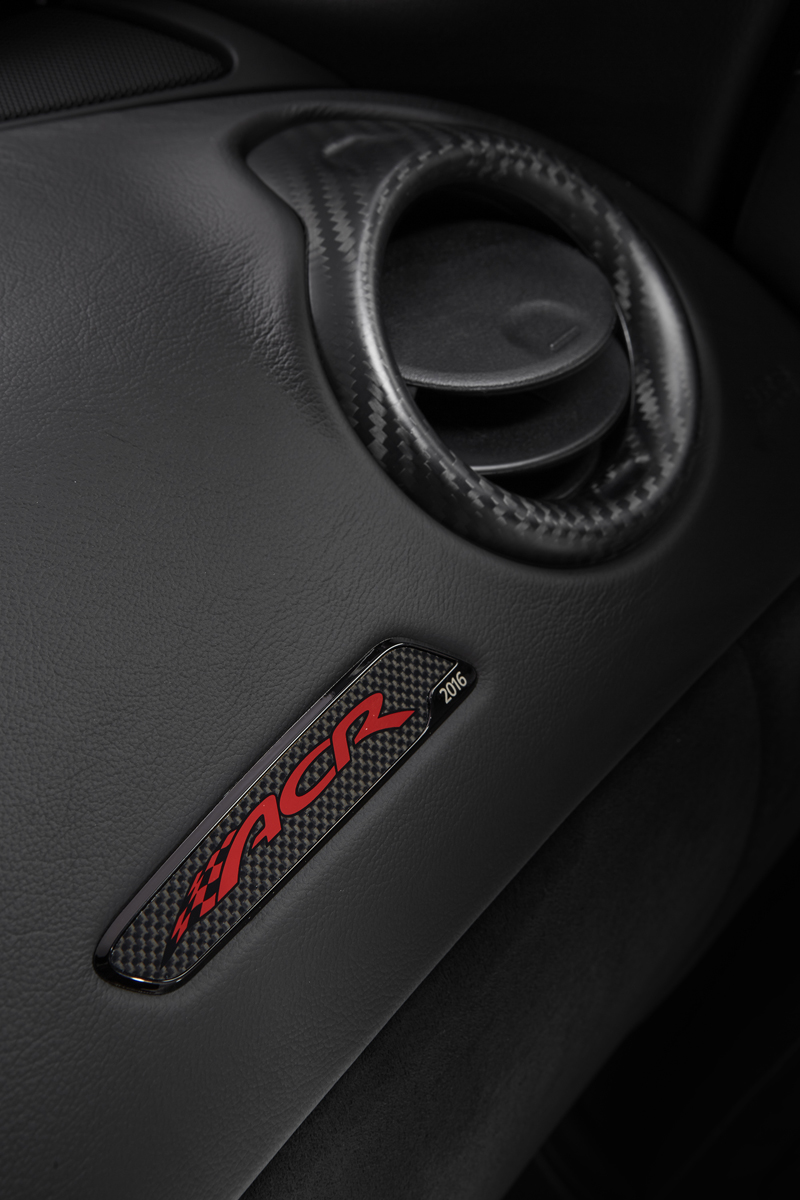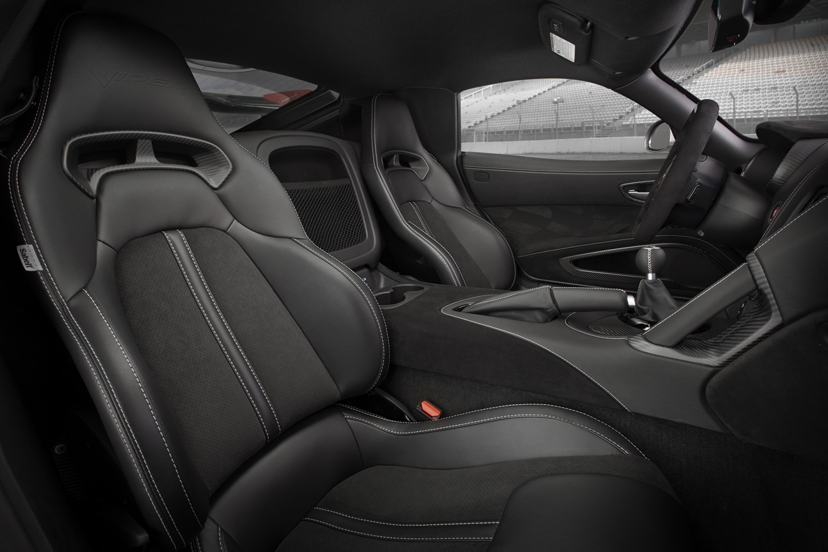 The interior of the 2016 Dodge Viper ACR has lightweight parts and grippy Alcantara trimmings. The instrument binnacle, lower instrument panel, and door armrest panels all wear Alcantara suede while Alcantara inserts are featured on the high-grip seats. Drivers grab onto an ACR-exclusive high-grip steering wheel with color racing stripe and badging. Lightweight carpeting and minimal three-speaker audio system help shave off a few extra pounds from the supercar. A special dashboard-mounted plaque in carbon fiber showcases the exclusivity of the track-spec weapon.
