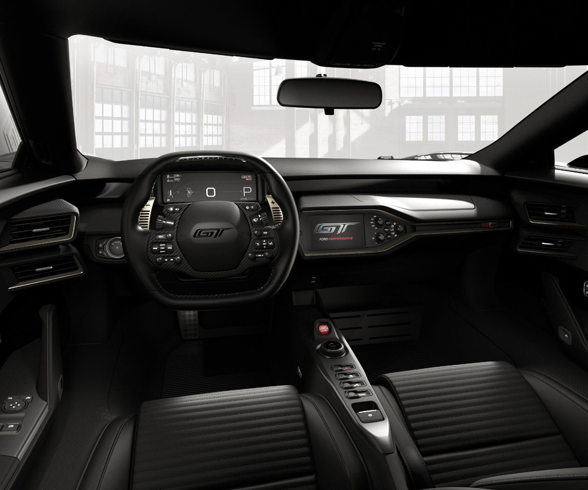Inside, both of the Ford GT carbon fiber seats are upholstered in Ebony leather with pillowed inserts and plow-through stitching. Ford GT logos are embossed in the headrests and steering wheel while gold appliqués are featured on the seat X-brace, shift paddles, and instrument panel. The same Ebony leather also adorns the instrument panel, pillars, and headliner. To pay tribute to the original Le Mans racer, the Ford GT ’66 Heritage Edition boasts a leather-wrapped steering wheel and blue webbing on the seat belts.