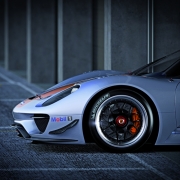 Porsche’s goal for designing the 918 RSR was to follow the “form follows function” philosophy. Taking inspiration from the 908 (1969) and 917 (1971) racecars, the shape of the body flows from front to rear with powerful extended wheel arches and large rear air intakes. The front features new carbon fiber air flics and splitters for downforce, while roof-mounted air intakes cool the engine and a large rear spoiler and diffuser keep the racer planted. Between the ram air intakes above the engine is a visible fan, paying homage to the legendary 917 racecar. Larger central-locking 19-inch wheels are fitted with no profile racing slicks are used for efficient tire changes. The entire 918 is dressed in a new “liquid metal blue chrome” paint that highlights the technologically advanced character of the racer, while Porsche Hybrid Orange is found on the brake calipers and side stripes.