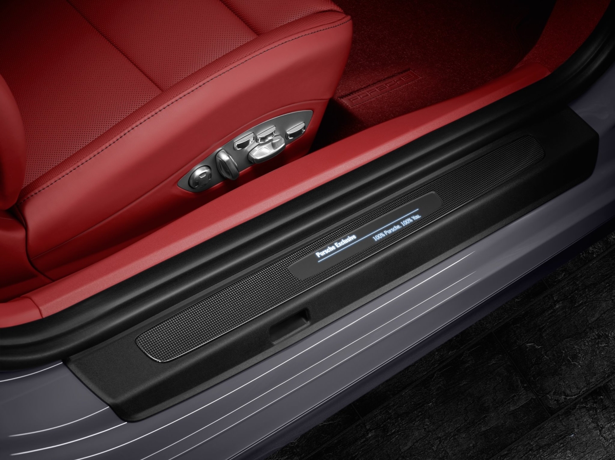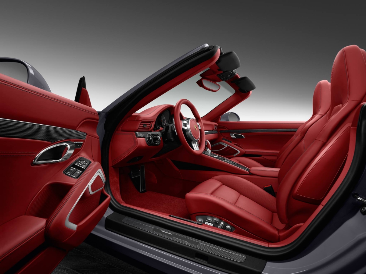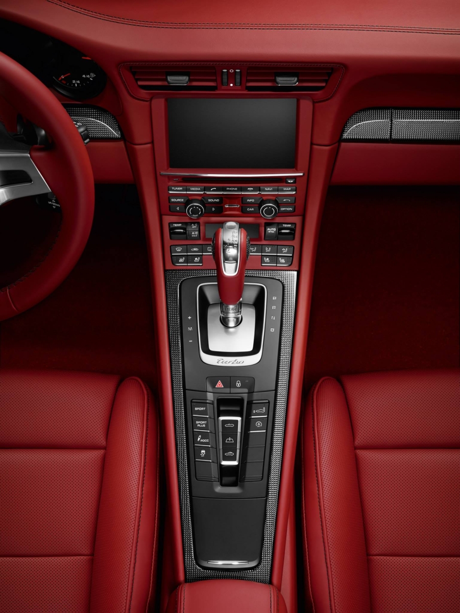 Inside, things take a dramatic turn as illuminated, personalized carbon door sills greet passengers. A vibrant Garnet Red leather interior with contrasting black stitching gives a special contrast to the exterior paint scheme, especially when the top is down. The Porsche Communication Management package comes trimmed in the red leather along with the air vents while the center console trim wears a sporty carbon fiber skin.