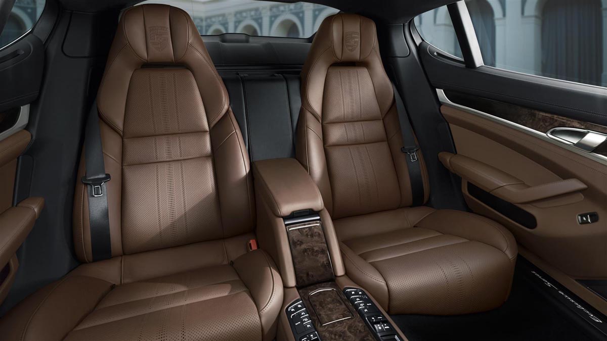 A wealth of handcrafted, exclusive luxury wraps passengers in the front and rear. Each seat and lower door panel wears special hand-picked Poltrona Frau leather in Chestnut Brown with perforated center panels in the form of a Porsche crest. Contrasting black milled nappa leather is worn on the upper door trim to emphasize contrast as seen on the exterior. This is also visible with the burled walnut wood up front that transforms into deep black piano lacquer as it moves towards the rear.