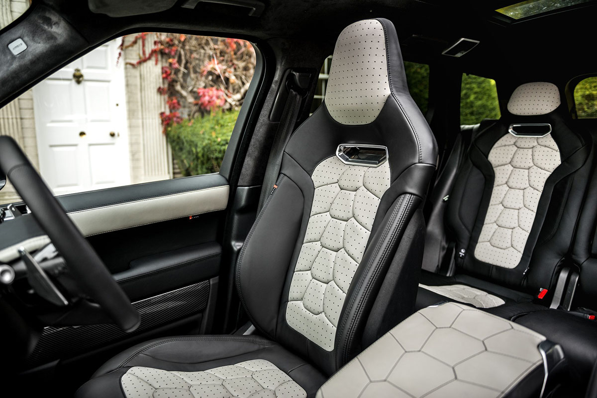 Step inside the Project Kahn Range Rover Sport SVR Pace Car First Edition and you’ll be greeted by a hand-upholstered interior. Here, the SVR sport seats have been given a special two-tone quilted and perforated leather that’s matched by the glovebox in a Hexagon quilted pattern. The arm rests, door panels, and even the steering wheel center hub have also been adorned in matching leather. Below, there’s a new set of vented foot pedals in machined aluminum while Kahn branding is neatly displayed throughout the cabin.