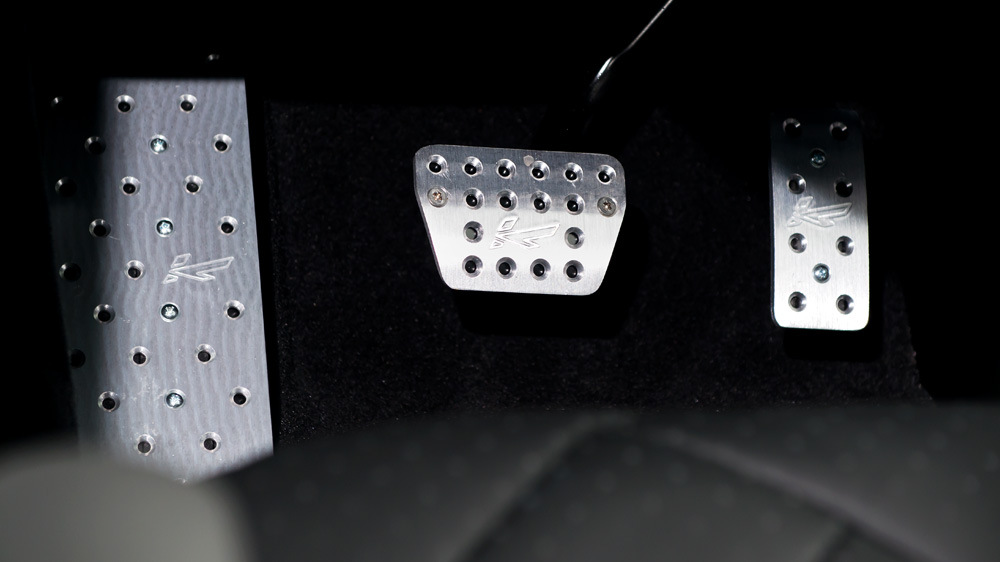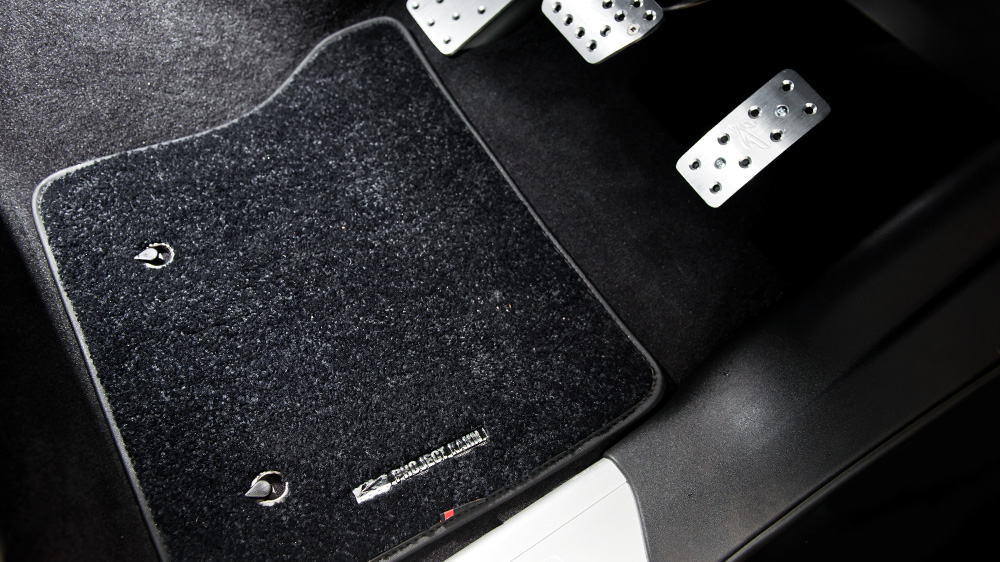 Step inside and you’ll be greeted by stainless steel door entry sills and a soft perforated Black leather upholstery worn by the front and rear seats. The same leather design was also applied to the glove box, instrument binnacle, and door panel tops for that extra touch of luxury. New floor mats and aluminum foot pedals were also installed by Project Kahn.