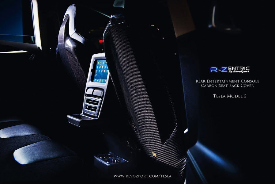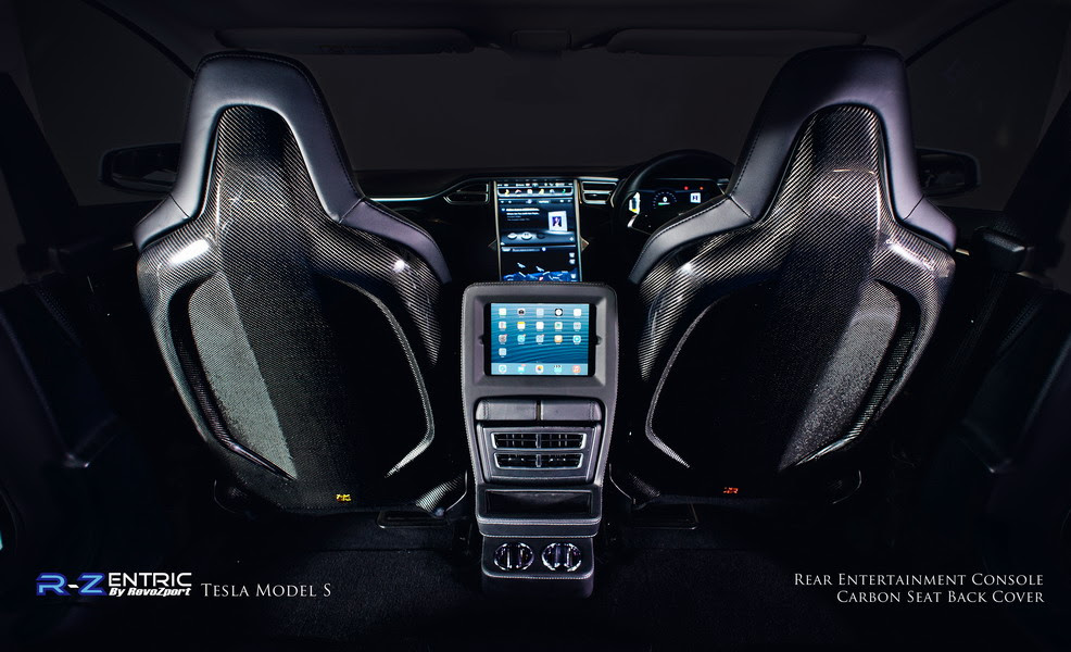 As part of the new upgrade program for the Tesla Model S, owners can opt for the R-Zentric rear entertainment console with support for iPad Minis as well as USB phone charging. The console can be finished in carbon fiber or fine leather as well. Additionally, new R-Zentric seatback covers made from 1.5-mm thick carbon fiber can be installed with a gloss or matte finish with optional color-coding as well.