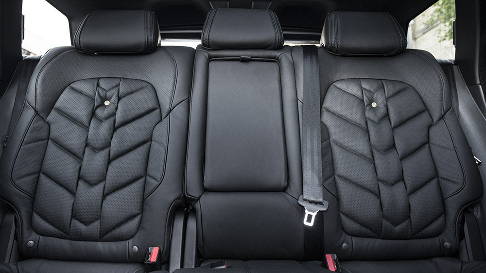 The dark-tinted privacy glass hides a soft Black quilted and perforated Herringbone leather upholstery inside the custom SUV. The luxurious leather is worn by the front and rear seats along with the door tops and arm rests, center console, instrument binnacle, and center of the steering wheel. Beneath the beltline lies stainless steel door sill plates and machined aluminum foot pedals.