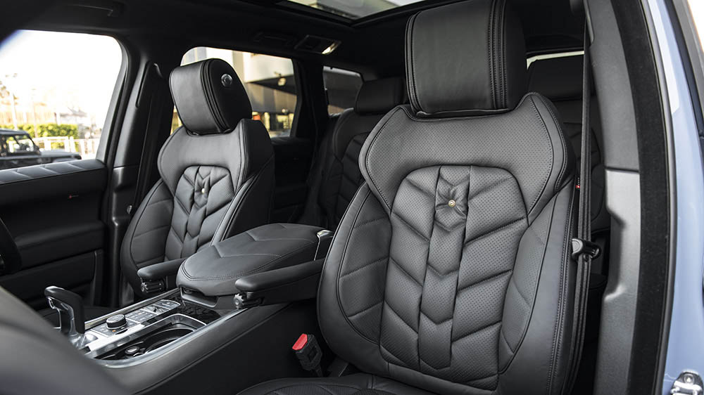 The exterior transformation, however, wasn’t done there. Beneath the flared fenders sits a new set of 23 x 9.5 RS alloy wheels with a Satin Black finish to match the new color combination. The Project Kahn Range Rover Sport Autobiography Pace Car also boasts a fresh set of 305/30/23 tires all around.