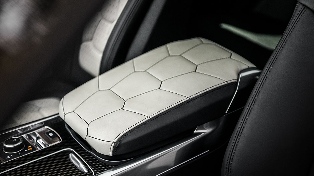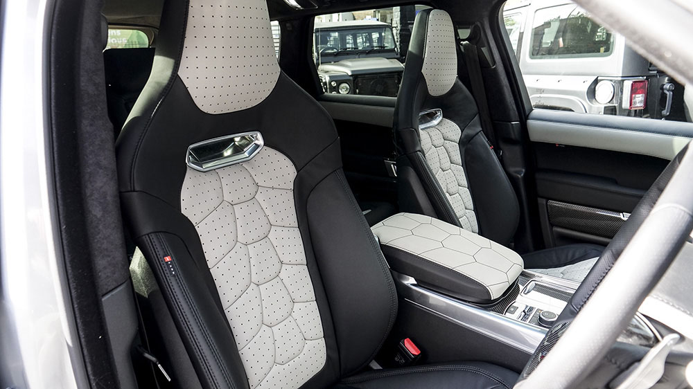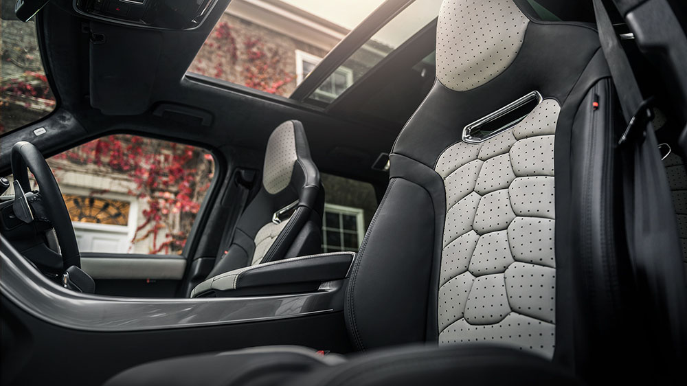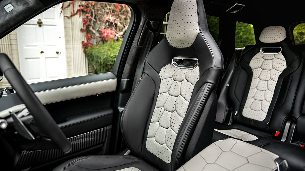Inside, the Project Kahn Range Rover Sport SVR Pace Car First Edition was given a more detailed, tailored touch. The SVR sport seats were outfitted with a soft quilted and perforated leather that is complemented by the center arm rest/console and steering wheel.