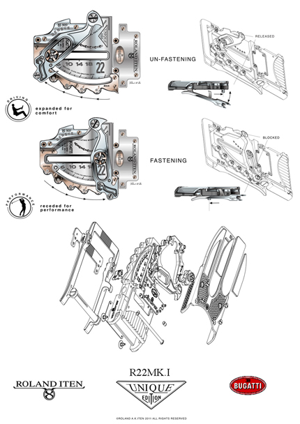 The new Roland Iten R22 Mk.I-22mm “Bugatti Edition” features an innovative mechanism that allows for the precise fit for any size within a 22 mm range. A special “engrenage” function utilizes flow-guiding wheels incorporated into the gear system’s teeth for minimal friction and a unique “click-free-click”. Instead of the traditional “Breguet Tooth” cog, Roland Iten uses Cog Wheels that virtually eliminate friction for increased longevity and a “rolling click” or “click-free-click” as referred to by Roland Iten.